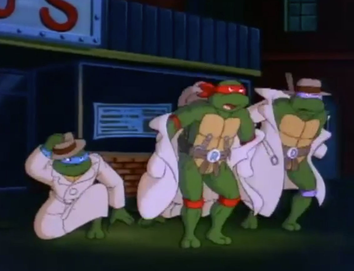 Lorsque Shredder « repasse les images » du combat en ville sur le portail, nous voyons Leonardo, Donatello et Usagi sur un fond blanc. Il s’agit des style guides utilisés pour la série et non d’images dessinées spécifiquement pour cet épisode.