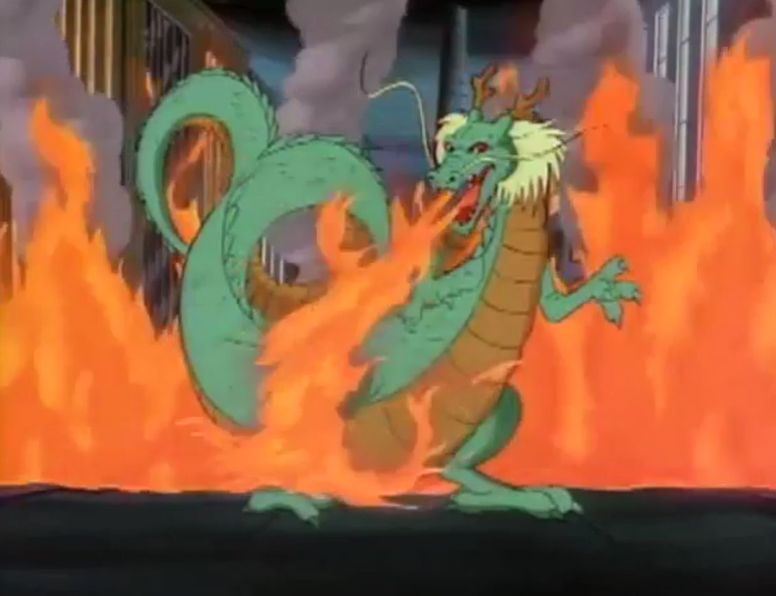 Les tortues attiraient le dragon en semant du blé derrière elles. Cela conduisait la créature géante vers l’usine d’incinération. Michaelangelo l’attendait, un four ouvert. Les flammes venaient jusqu’à lécher le museau du dragon, qui s’étouffait. Bientôt, il parvenait à son tour à cracher du feu ! C’était de pire en pire !