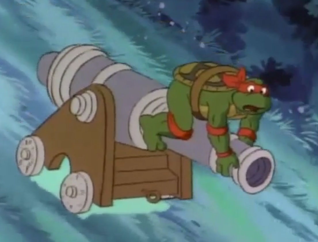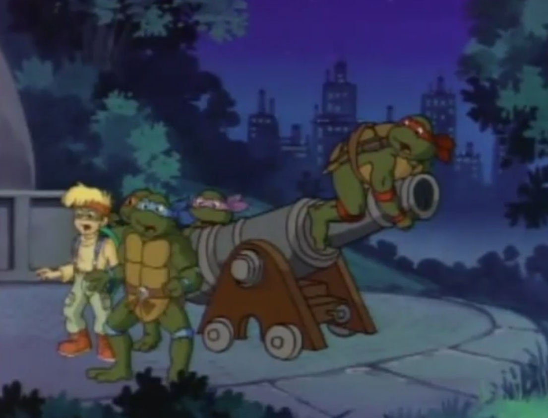 Entendant un véhicule arriver dans les égouts, qui plus est avec un pied rouge sur la paroi, les tortues sautaient dessus pour le détruire. Zach en sortait, prévenant les tortues des évènements récents. Il ajoutait que Walt avait « emprunté » les documents prouvant l’imposture de Shredder. Couvert de honte, l’adolescent avouait avoir caché les papiers dans la gueule du canon du parc. Le drone avait permis à Shredder d’entendre les précieuses informations. Il se rendait sur place à l’aide d’un module. Voyant les tortues s’approcher, il ordonnait à ses mutants de faire feu avant de se lancer à leur poursuite à bord d’un ballon dirigeable de l’armée. Leonardo grimpait sur un ballon d’hélium pour se lancer à leur poursuite et tranchait la toile de l’appareil. Shredder s’écrasait au sol, mais au moins il avait le plan !