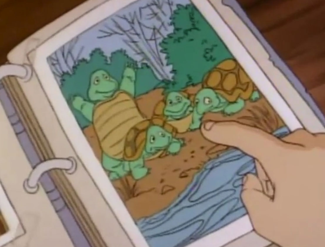 Dans le salon du repaire des tortues, Donatello racontait une de ses aventures à Zach et à son frère Walt tandis que Michaelangelo voulait leur montrer leur album souvenir. À l’intérieur s’y trouvait des photos de leurs aventures, mais aussi des éléments marquants comme leur première pizza, ou encore le plan d’accès du repaire, à l’époque où les jeunes mutants avaient encore du mal à s’orienter dans les égouts. Dans cette petite pochette se trouvait également la preuve indiscutable que Shredder avait volé le Foot Clan à Splinter, le contraignant à quitter le Japon (Sur la piste des tortues, S1E1). Se faisant tard, Walt prétextait pour que son frère et lui s’en aillent. Il venait de ramasser au sol la pochette avec ces précieuses informations.