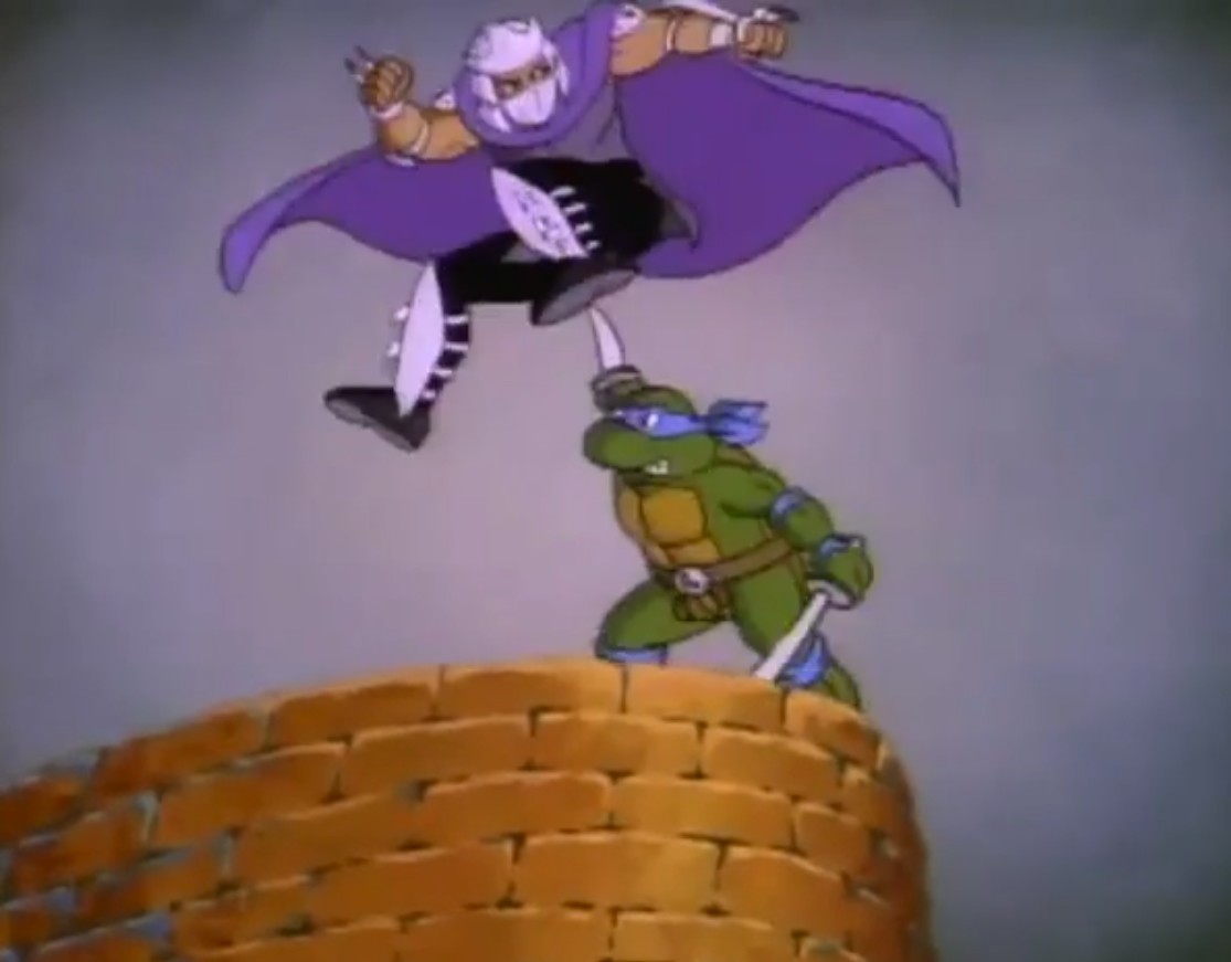 - Le combat entre Leonardo et Sherdder, au bord d’un précipice dans les égouts, est répétée lorsque le grybyx s’empare du fusil laser