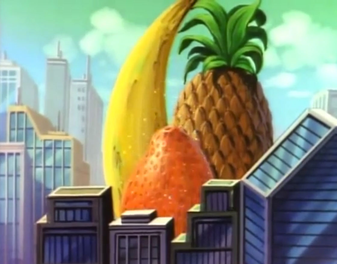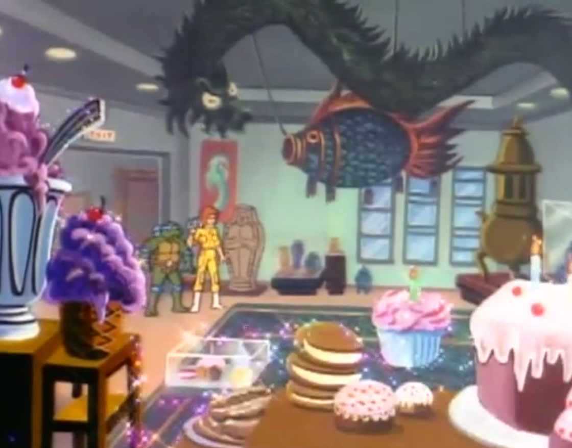 Les tortues avaient demandé de l’aide auprès d’April. Tandis que Donatello apportait le portail interdimensionnel portatif, Raphael et Michaelangelo partaient empêcher Shredder de faire le transfert de pétrole. Leonardo et April conduisaient Ogg dans un musée et l’enfermaient dans un sarcophage égyptien. En représailles, la petite créature volante changeait le mobilier exposé en gâteaux. Bientôt, c’était toute la ville qui se transformait en fruits géants. Ils devaient s’empêcher de le ramener de là où il venait.