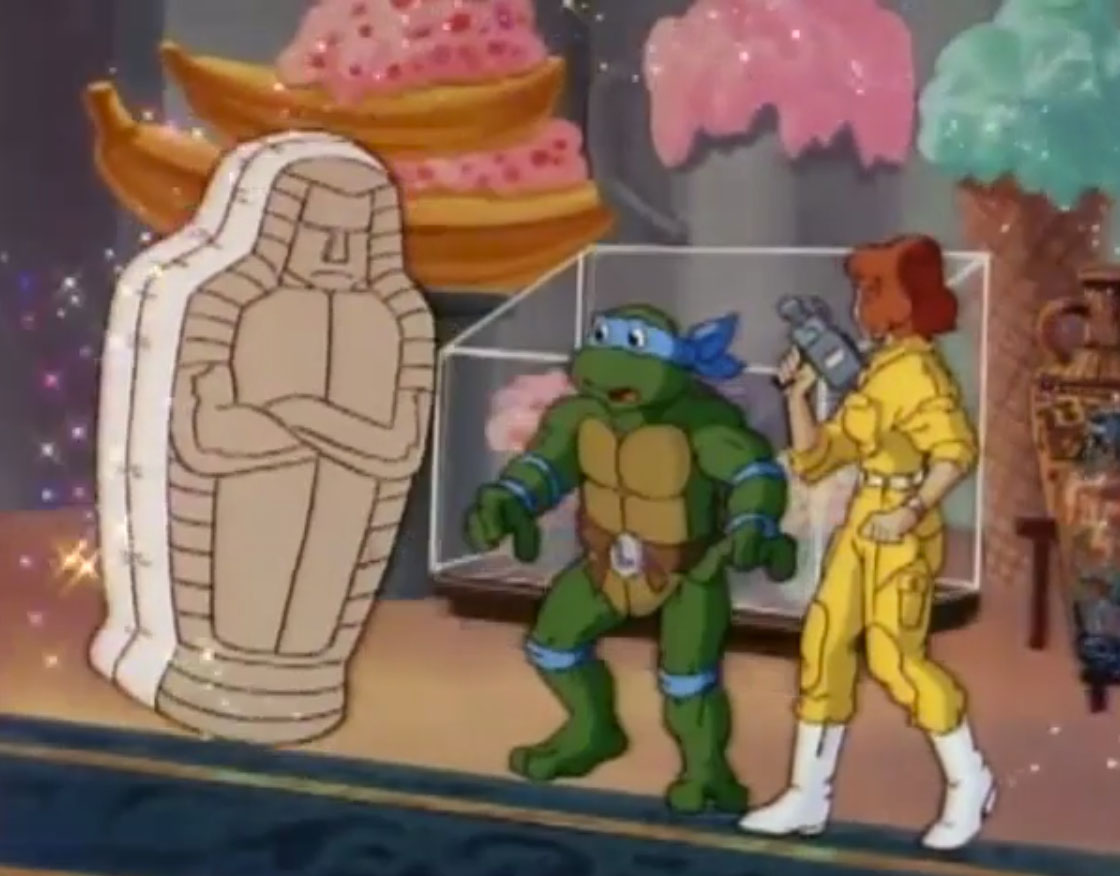 Au musée, Ogg parvenait à se sortir de son sarcophage et échappait à Leonardo et April. Pour l’attirer de nouveau, ils auraient besoin de vieilles céramiques. April dénichait un vieil antiquaire et lui demandait s’il avait des imitations de vases Hu Yu. C’était un bon plan ! Mais il ne fallait pas qu’il les trouve avant que Donatello ne soit revenu avec le portail. Le cas contraire, ils n’auraient plus d’appât pour se débarrasser de monsieur Ogg. Même si la situation était critique, April s’empressait de filmer tout ce qui se passait et se rendait compte que les transformations de l’extraterrestre n’étaient que des illusions. Rien n’apparaissait à sa caméra.