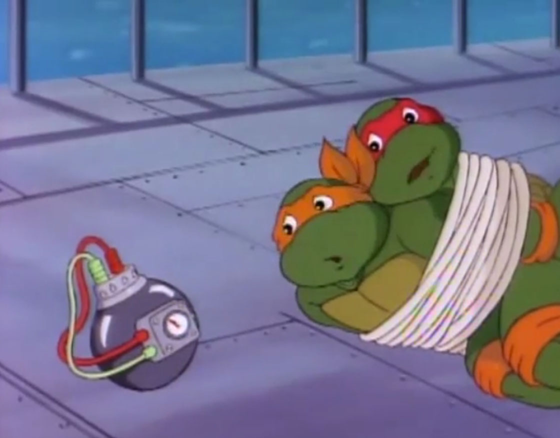 Donatello peinait à transporter son portail à travers les égouts. Ses frères apercevaient au loin Bebop et Rocksteady assurer le transfert du pétrole. Montant sur le pont du navire, elles parvenaient à dégager les deux mutants, mais Shredder les arrêtait. Après les avoir ficelées à une chaise, il s’apprêtait à quitter le navire. Mais pas sans laisser une bombe au pied de ses adversaires.