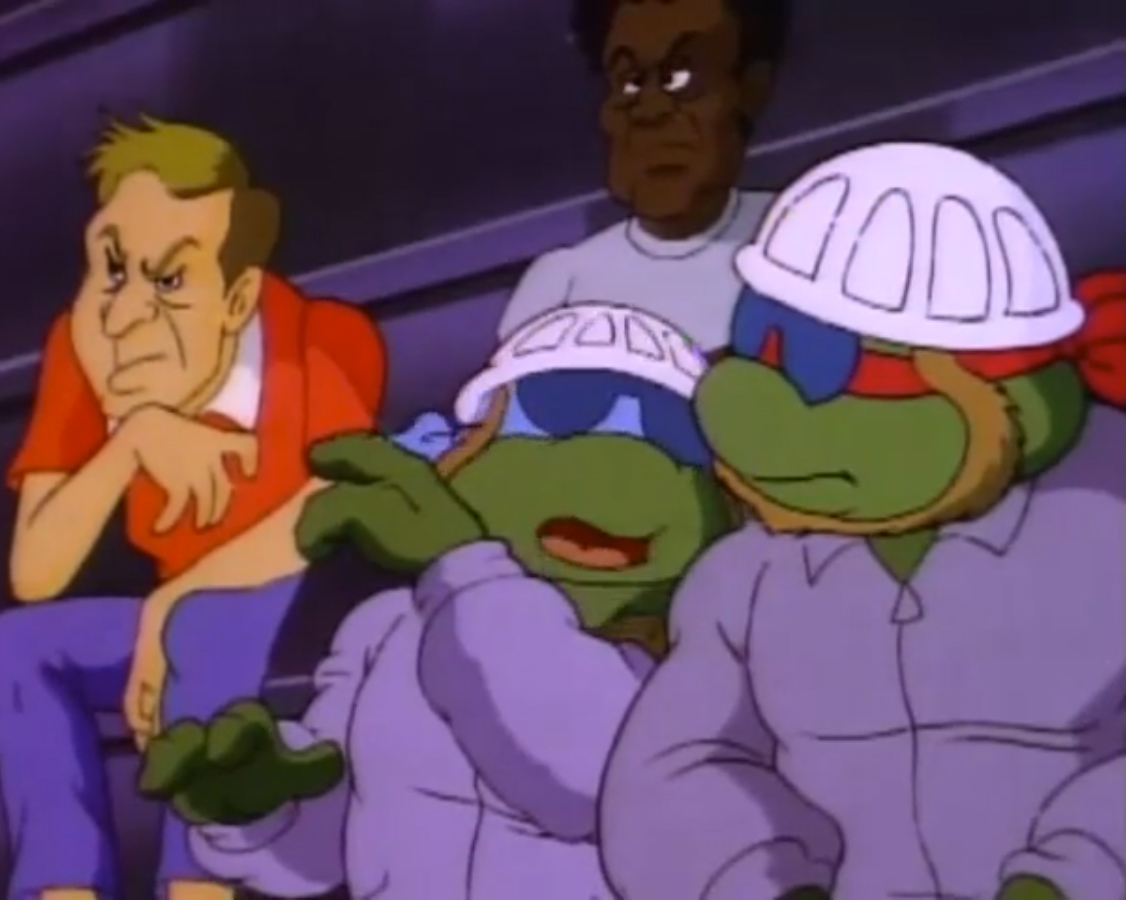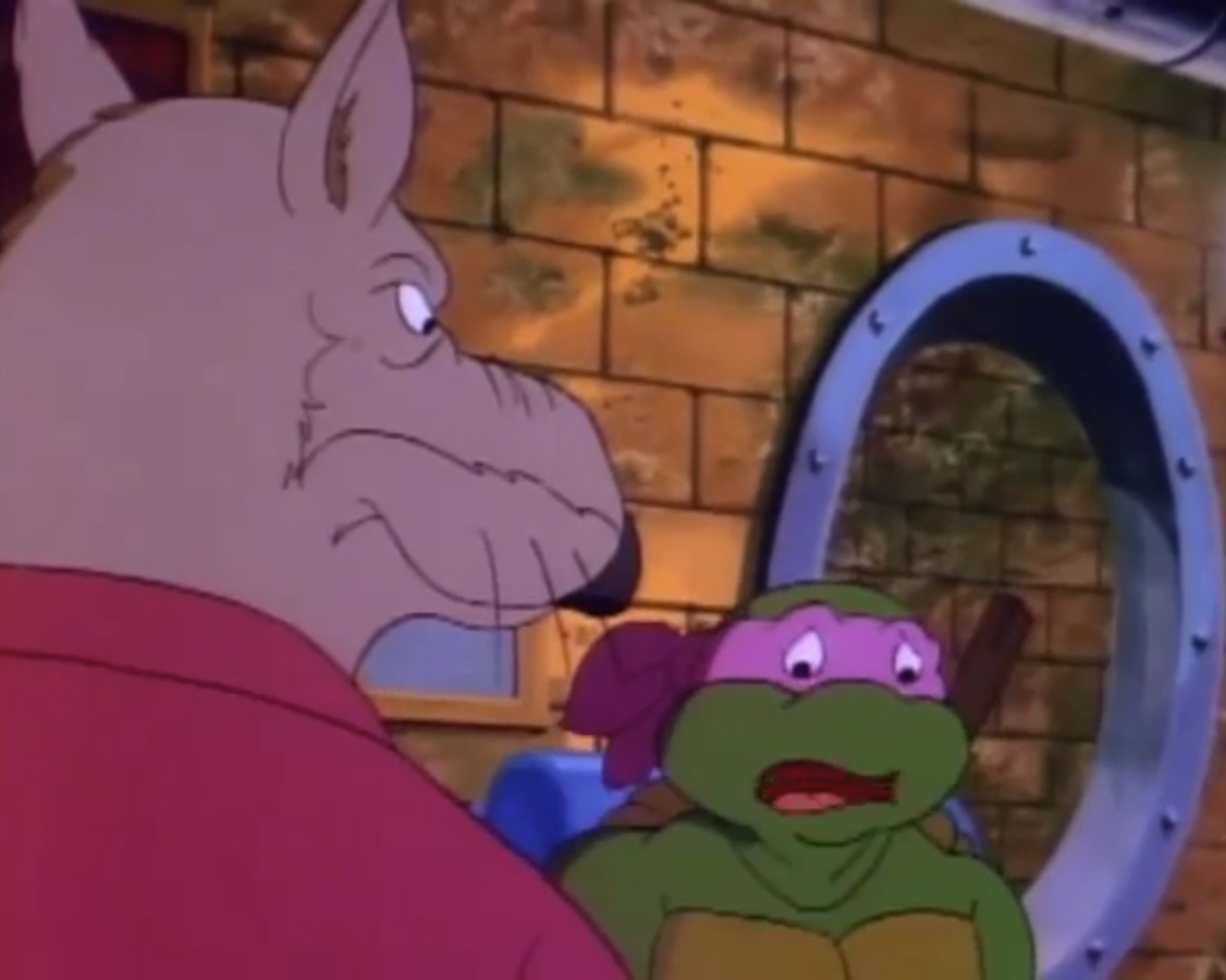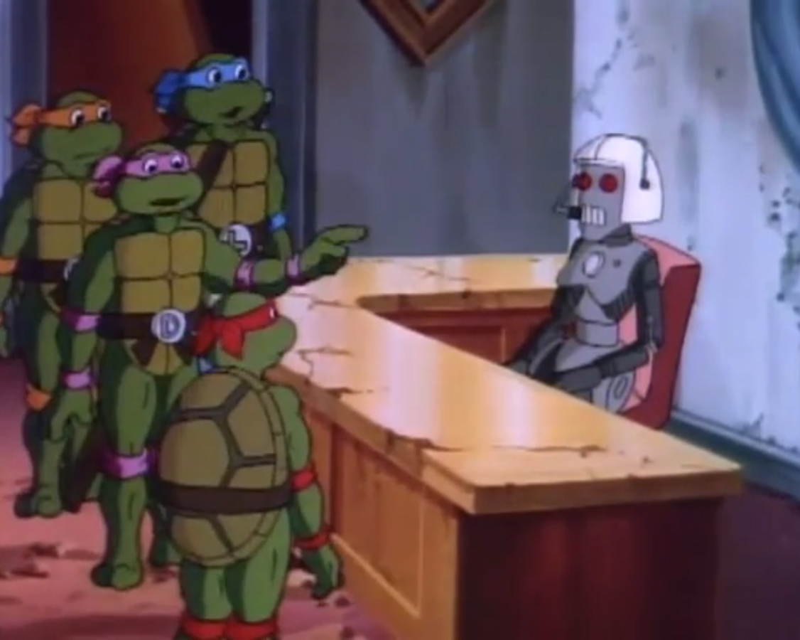 Arrivant devant l’immeuble de Channel 6, le constat était le même que pour le reste de New York. En ruine. Les tortues voulaient emprunter l’ascenseur, qui s’écrasait devant elles. Après avoir monté les étages à pieds, les tortues s’entretenaient avec le robot secrétaire qui remplaçait Irma. Mais celui-ci était en piteux état, à l’image du reste de la ville. Après un dysfonctionnement, il explosait. Les tortues allaient devoir se débrouiller une fois encore seules. Elles atteignaient finalement le bureau de la journaliste. L’intérieur n’avait rien à voir avec le bureau qu’elles connaissaient. Ni à ce que l’on pouvait voir dans le reste de la ville. Il s’agissait d’un harem ! Et April et Irma étaient les occupantes du lieu. À la vue des tortues, elles prenaient la fuite en criant au secours. Les quatre frères étaient surpris qu’elles ne les reconnaissent pas. Mais pire encore, les cris avaient alertés Bebop et Rocksteady. Surprenamment, ils n’étaient pas des mutants, mais bien des humains ! Et comme les autres, ils ne reconnaissaient pas les tortues. Les deux brutes sortaient des armes laser de derrière le canapé pour tirer sur les intrus. Leonardo grimpait aux rideaux pour les décrocher et les faisait tomber sur les deux