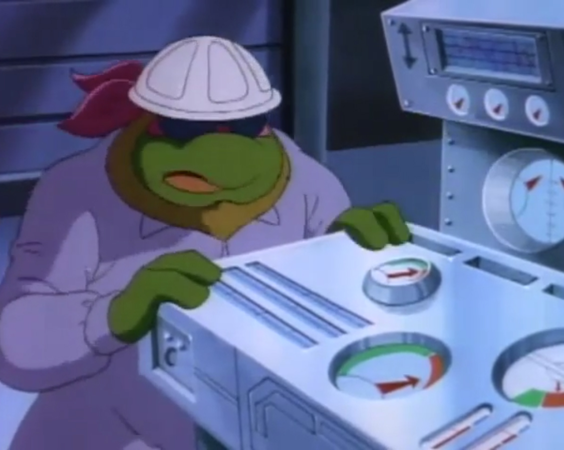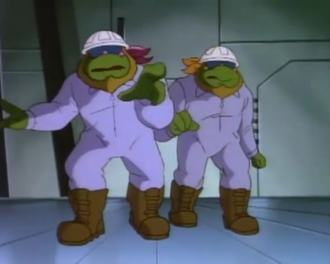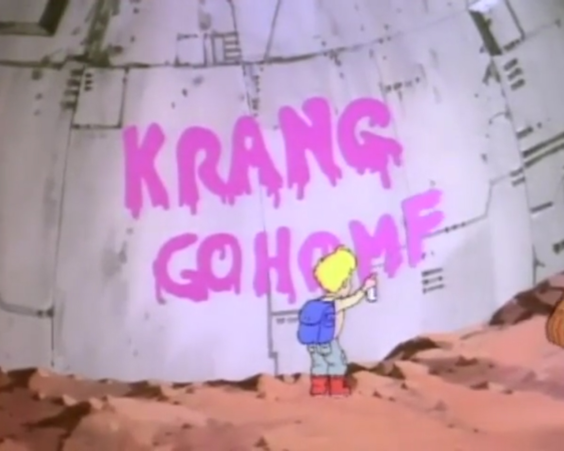 arrivaient au Technodrome. Celui-ci était une véritable épave. Troué par endroit, de la fumée en sortait. Cela faisait des années qu’il n’était plus fonctionnel. Un jeune garçon écrivait à la bombe rose « Krang go home » (Krang rentre chez toiVF) avant de se faire arrêter par un soldat de pierre. Donatello envoyait son bâton dans les jambes du caillou ambulant pour le neutraliser. Michaelangelo reconnaissait Zach. Mais pas l’enfant. En revanche, il était le premier à ne pas fuir les quatre mutants en les voyants. Il acceptait même de les aider à pénétrer dans le Technodrome. Après avoir trouvé un bon costume, celui de réparateurs, les tortues forçaient le passage auprès du Général Traag en trouvant une excuse bidon. Le congélateur d’électron fuyait dans le plasmatron !