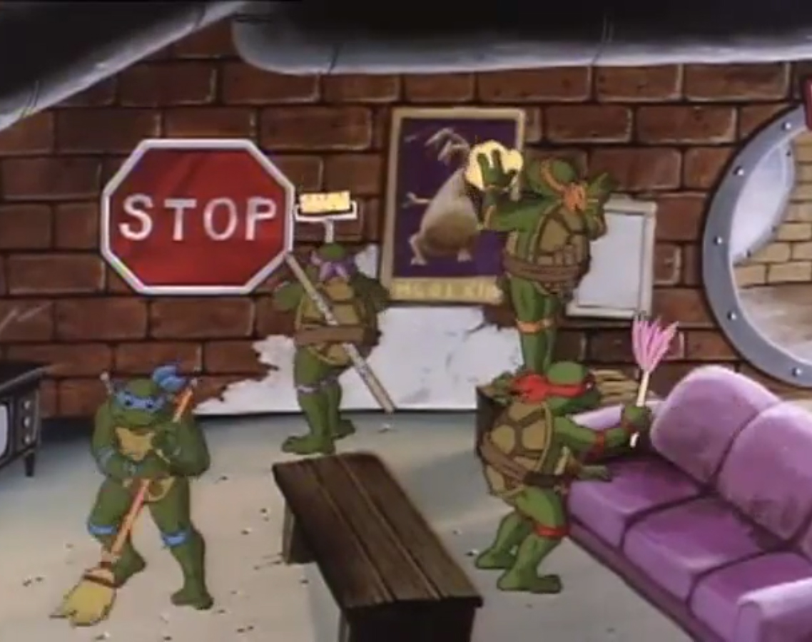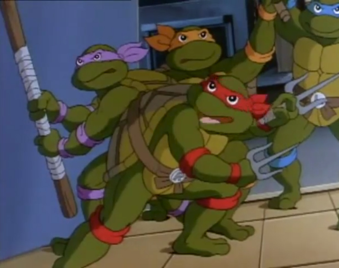 Dans les appartements de Splinter, les tortues craignaient que cela n’ait pas fonctionné. Michaelangelo avait une brillante idée pour s’assurer que Shredder ne se trouvait plus dans le corps de leur sensei et lui tendait une part de pizza. Quelle horreur disait-il ! Splinter était