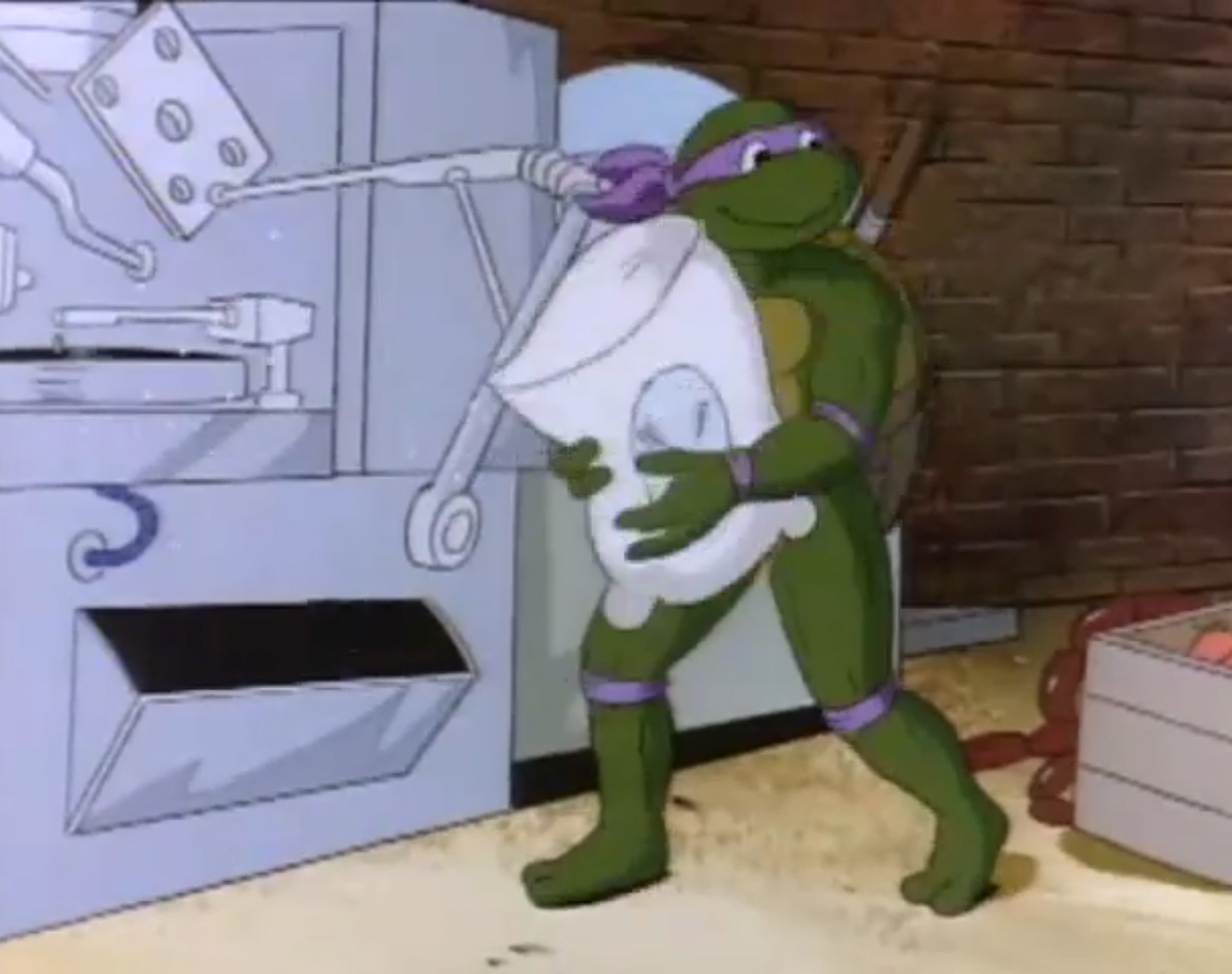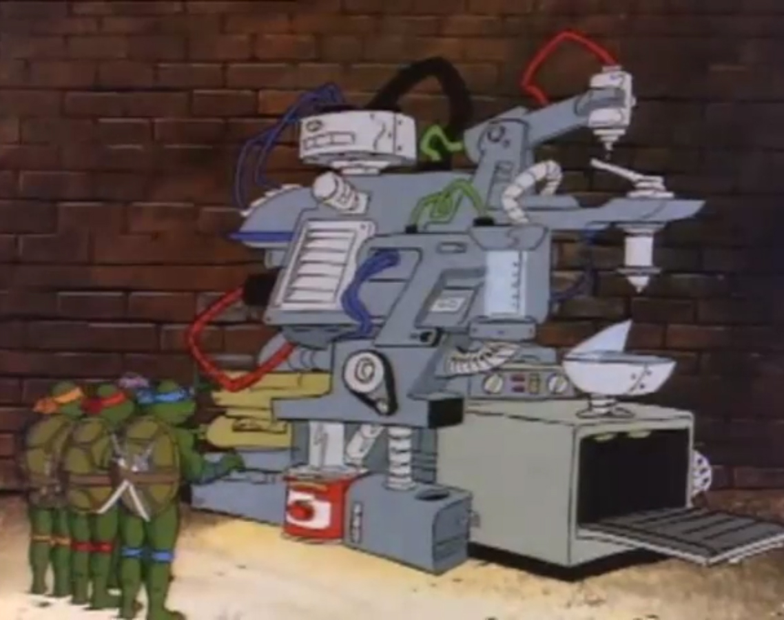 Dans les égouts, Donatello présentait sa nouvelle invention à ses frères. Une machine à faire des pizzas très rapidement. Il lançait une démonstration. Mais comme bien souvent, la machine n’était pas au point… Mettant les ingrédients, une première pizza était prête en quelques secondes. Puis Michaelangelo lui demandait de la faire passer à la production maximale. Des dizaines de pizzas sortaient en un clin d’œil, toutes chaudes et prêtes à être dévorées. Mais la machine commençait à s’emballer. Les pizzas se retrouvaient garnies d’huile et de boulons. Puis l’invention explosa. Il y avait de la pâte partout ! Splinter voyait que Leonardo avait une petite blessure au bras et s’inquiétait pour lui. Au même moment, April contactait ses amis pour les avertir que Shredder et ses acolytes se trouvaient dans un entrepôt. Le rat se proposait de venir avec ses élèves, préférant garder un œil sur Leonardo, diminué par sa blessure.