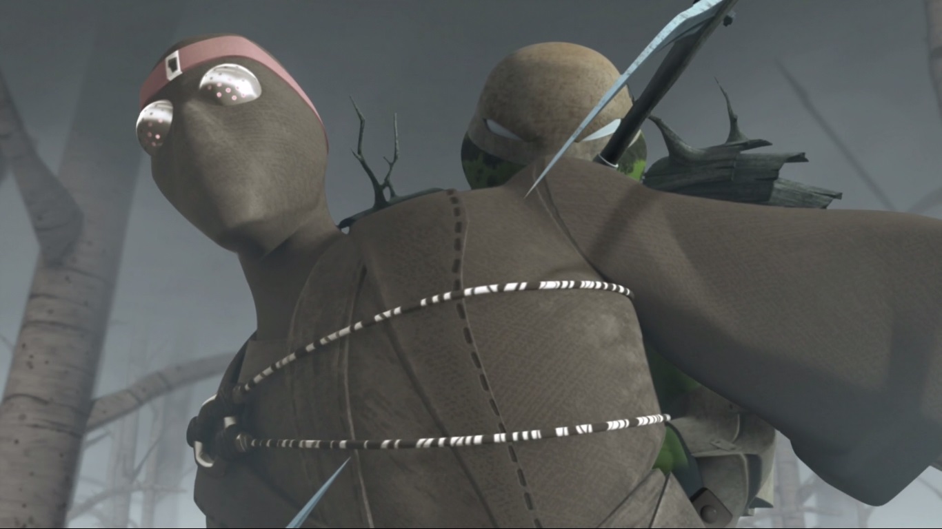 Dans la forêt, les tortues commençaient par méditer sur la cime des arbres. Michelangelo essayait aussi d’approcher les écureuils dont il avait si peur. Cet entraînement se montrait très bénéfique. Le deuxième soir venu, Leonardo aperçut le daim qu’il avait croisé précédemment. Aussitôt, la créature disparut et se fit remplacer par un daim à la forme humanoïde. Craignant d’avoir encore à faire à un mutant, ses frères fondaient sur l’intrus sans se poser de questions. Tel un signe, ils se faisaient tous vaincre par leur propre maladresse. L’animal n’avait même pas eu besoin de se défendre. Leonardo cherchait à arrêter les tortues, en vain. L’étrange créature avait disparue.