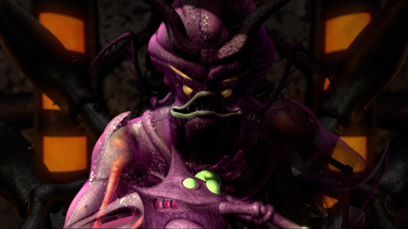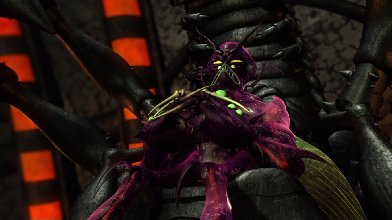Après avoir pénétré dans le sinistre palais du seigneur des insectes, les tortues apercevaient Sal Commander au centre d’une pièce sombre. Il s’agissait naturellement d’un piège, et le corps gisant au sol n’était qu’un hologramme. Michelangelo et Casey se retrouvaient immédiatement emprisonnés dans une capsule qui se formait autour d’eux. Un rire glauque résonna dans la salle ; Dregg se trouvait sur son trône, observant la scène en contrebas. Apparaissaient ensuite Armaggon et Sal Commander. Mona Lisa, restée jusqu’alors en retrait, les rejoignait l’air abattue. Raphael était désemparé, son amour les avait trahis. Seules les deux tortues subsistaient. Leonardo sautait sur les vreens et essuyait un premier tir. De sa lame, il pourfendait un des insectes avant d’être abattu par un second tir. Armaggon s’approchait de Raphael, agenouillé, les saïs à terre. Il ne cherchait même pas à se défendre, atterré par la nouvelle.
