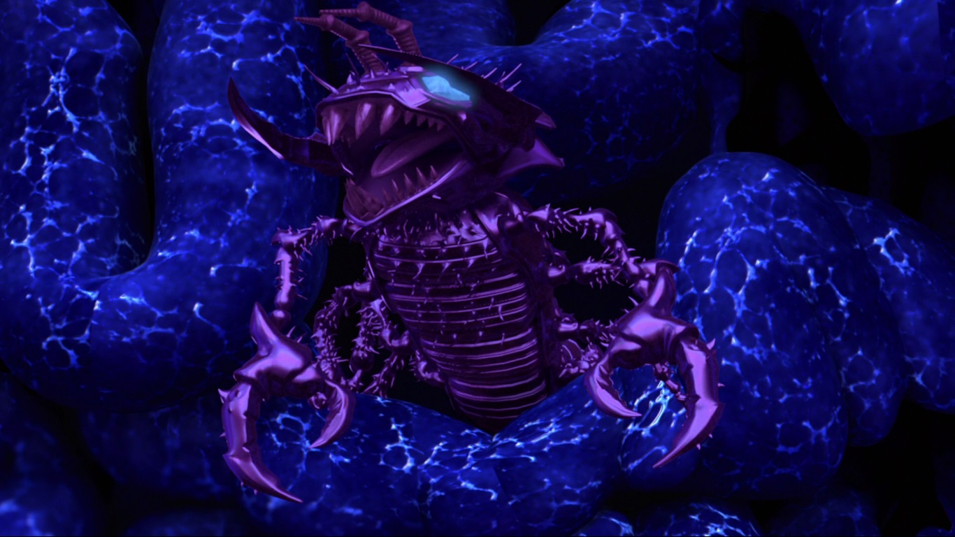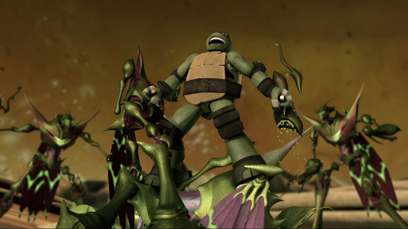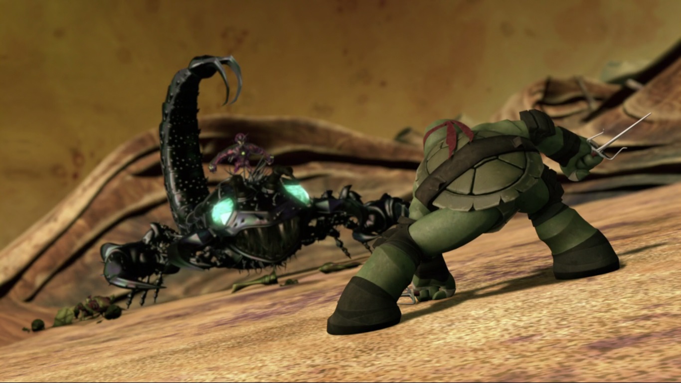 Il n’en fallait pas plus à la tortue pour se ressaisir et sauter sur les soldats de Dregg. Les autres compagnons en faisaient de même et très vite, les membres des vreens volaient dans tous les sens et les rangs commençaient à s’éclaircir. C’est alors que Mona Lisa poussa un cri strident. Le scorpinoid de Dregg venait de la frapper de son dard dans le dos. Raphael devenait fou et se ruait sur la créature pour frapper Dregg. Son poing faisait voler la tête du seigneur des insectes à terre, laissant apparaitre une créature robotique. Lord Dregg maîtrisé, la tortue partait au chevet de Mona. L’Ulixes achevait le travail de ses lasers et tuait les derniers vreens. Le scorpinoid, aussi touché, se retournait sur le dos, les pattes et la queue recroquevillés. C’en était fini pour lui. L’armée de Dregg n’était plus.