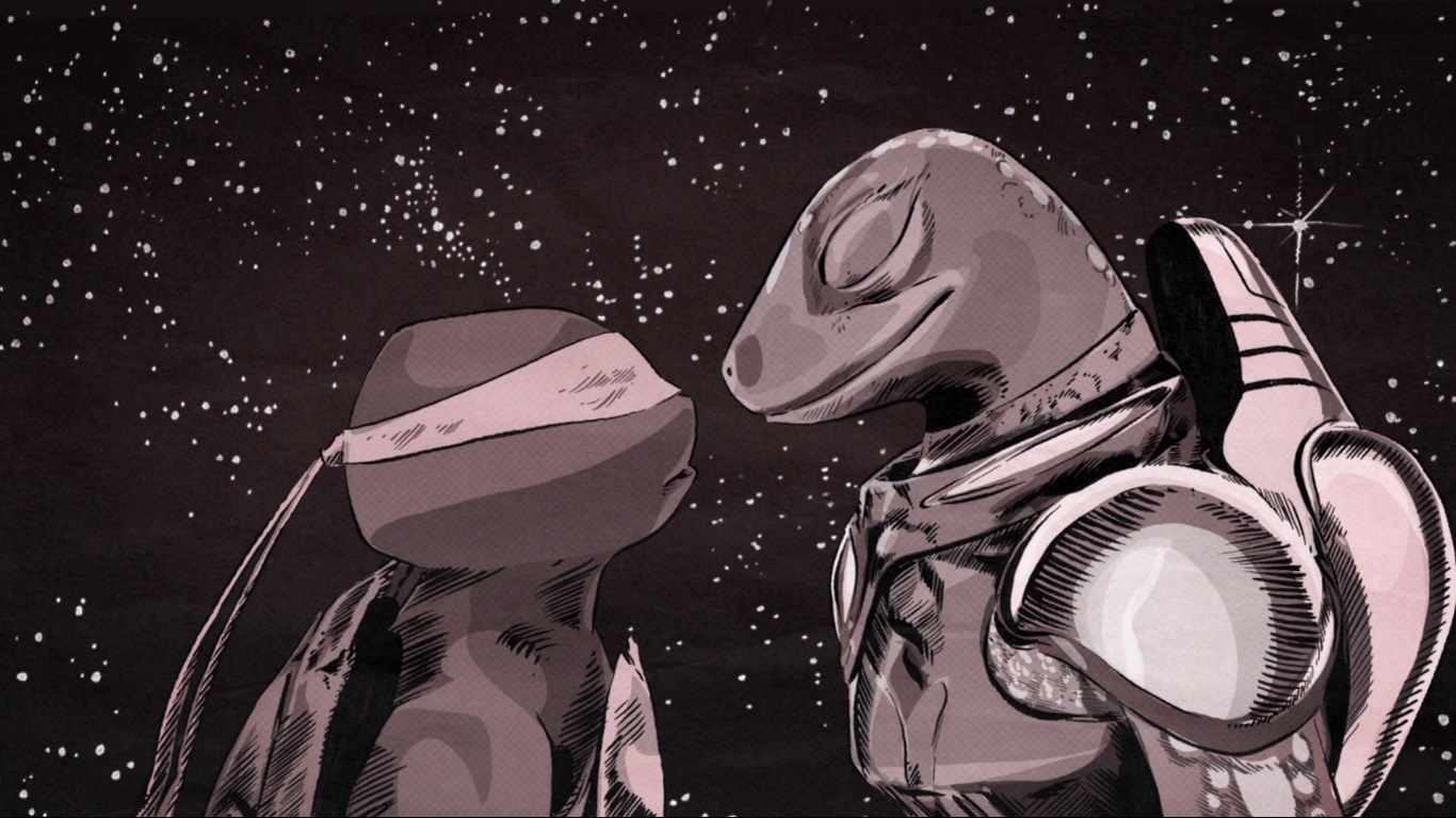 Soudain, l’écran du vaisseau s’alluma, et Mona Lisa apparut demandant de l’aide aux tortues ; Sal Commander, son supérieur, venait de se faire capturer par Armaggon, le chasseur de primes. Une fois à bord elle expliquait ce qu’il s’était passé en détail. Son supérieur avait été remis à Lord Dregg, sur sa propre planète, Sectoid 1. Il allait falloir se rendre dans l’endroit le plus malfamé de la galaxie. Pour Raphael, hors de question d’abandonner l’ami de sa bien-aimée. Leonardo était de son avis.