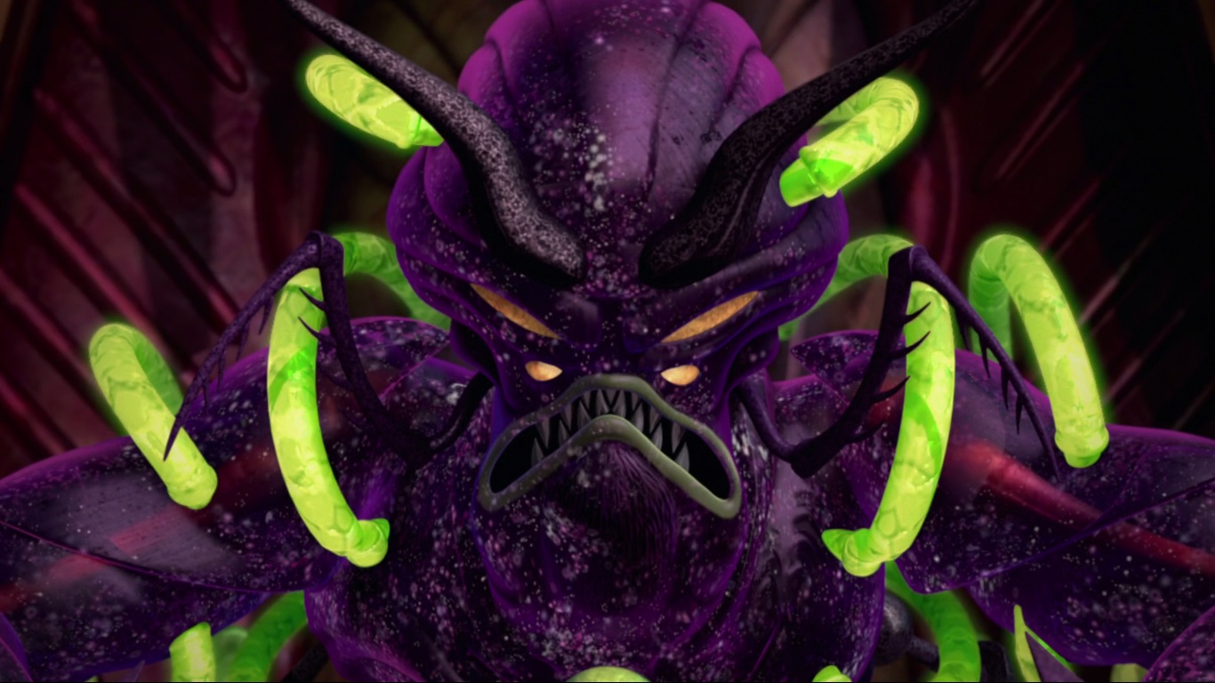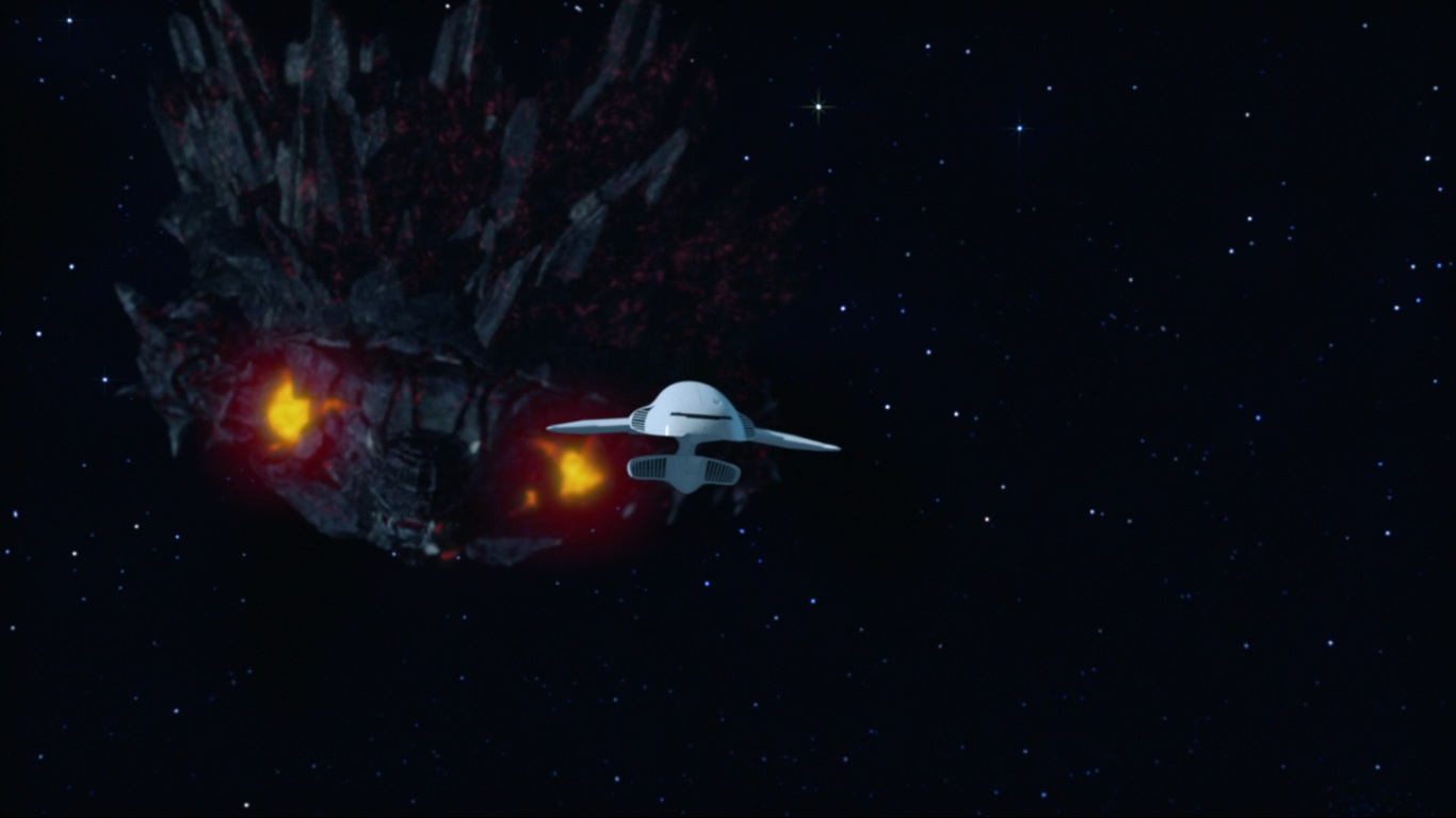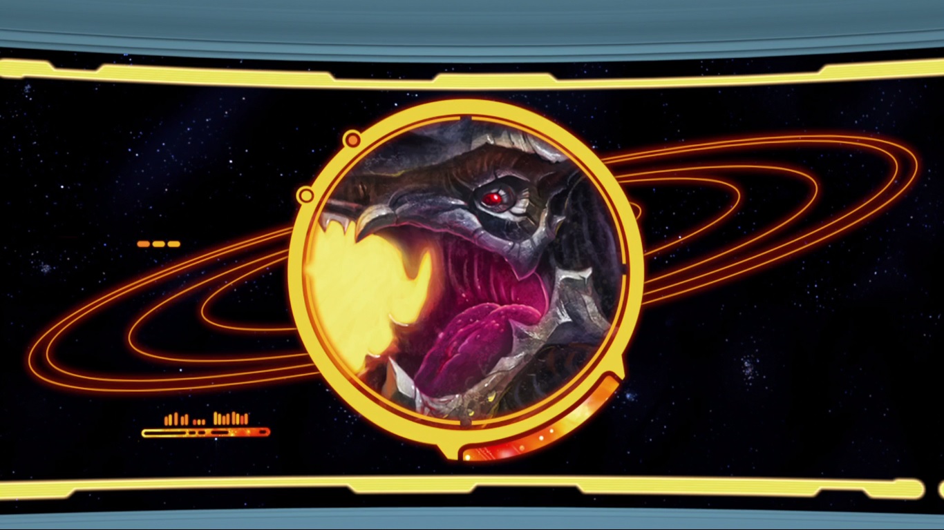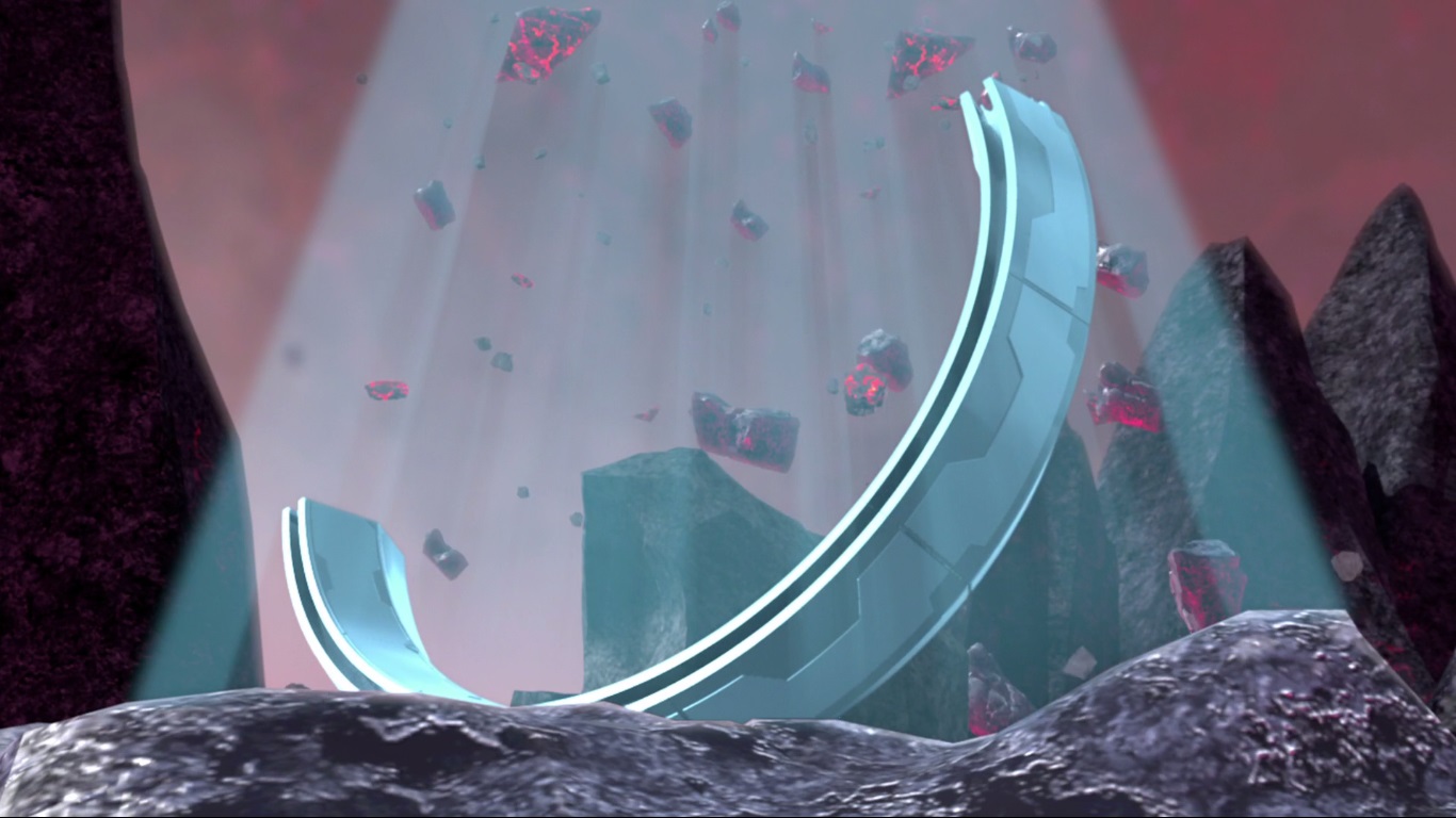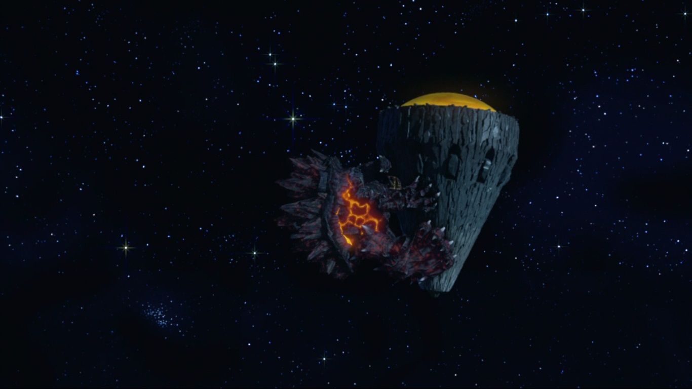 Dans son vaisseau destroyer, Mozar n’avait qu’une idée en tête : redevenir amiral grâce au troisième fragment du Cœur des Ténèbres. L’Ulixes avait du mal à se poser sur la planète, malgré une zone dégagée et plutôt calme. Ils ne tardaient pas à arriver sur l’îlot où se trouvait le dernier fragment. Il s’agissait d’une étendue arrondie faite de pierres saillantes. Au centre, se trouvait le générateur. Le Fugitoid essayait d’enlever le précieux artefact à l’aide du rayon tracteur du vaisseau. Le fragment bloqué dans les rochers ne bougeait pas. Ils allaient devoir se poser pour réaliser l’opération manuellement. Un autre problème survint alors. Des tirs frappaient le vaisseau du professeur Honeycutt ; il s’agissait de Dregg et de son Hornetron. Le seigneur de Sectoid 1 comptait bien se venger de la mort de son scorpinoid préféré (Dregg le maléfique, S4 E12). Leonardo ne voulait pas perdre de temps et ordonnait la charge de l’assaillant. L’Hornetron libérait quelques vreens, mais Casey et Raphael veillaient à ce qu’ils n’approchent pas à l’aide de la tourelle laser. Une fois les ennemis vaincus, ils tiraient simultanément sur le vaisseau de Dregg. Celui-ci volait en fumée. Toutefois, l’Hornetron n’était pas le seul à avoir subi des dommages. Très rapidement, l’Ulixes s’écrasait sur la planète de magma. Tandis que le Fugitoid restait pour réparer les dégâts, l’équipage partait à la recherche du dernier fragment