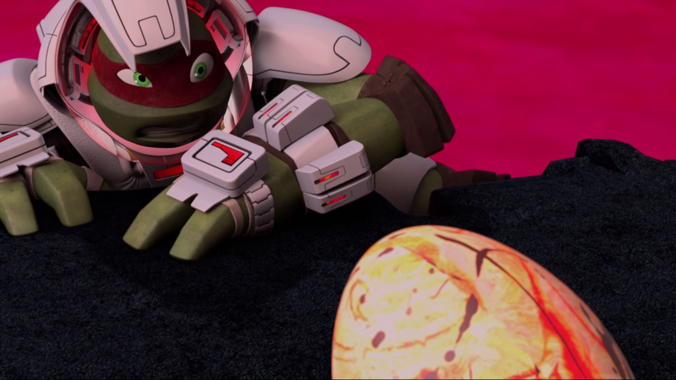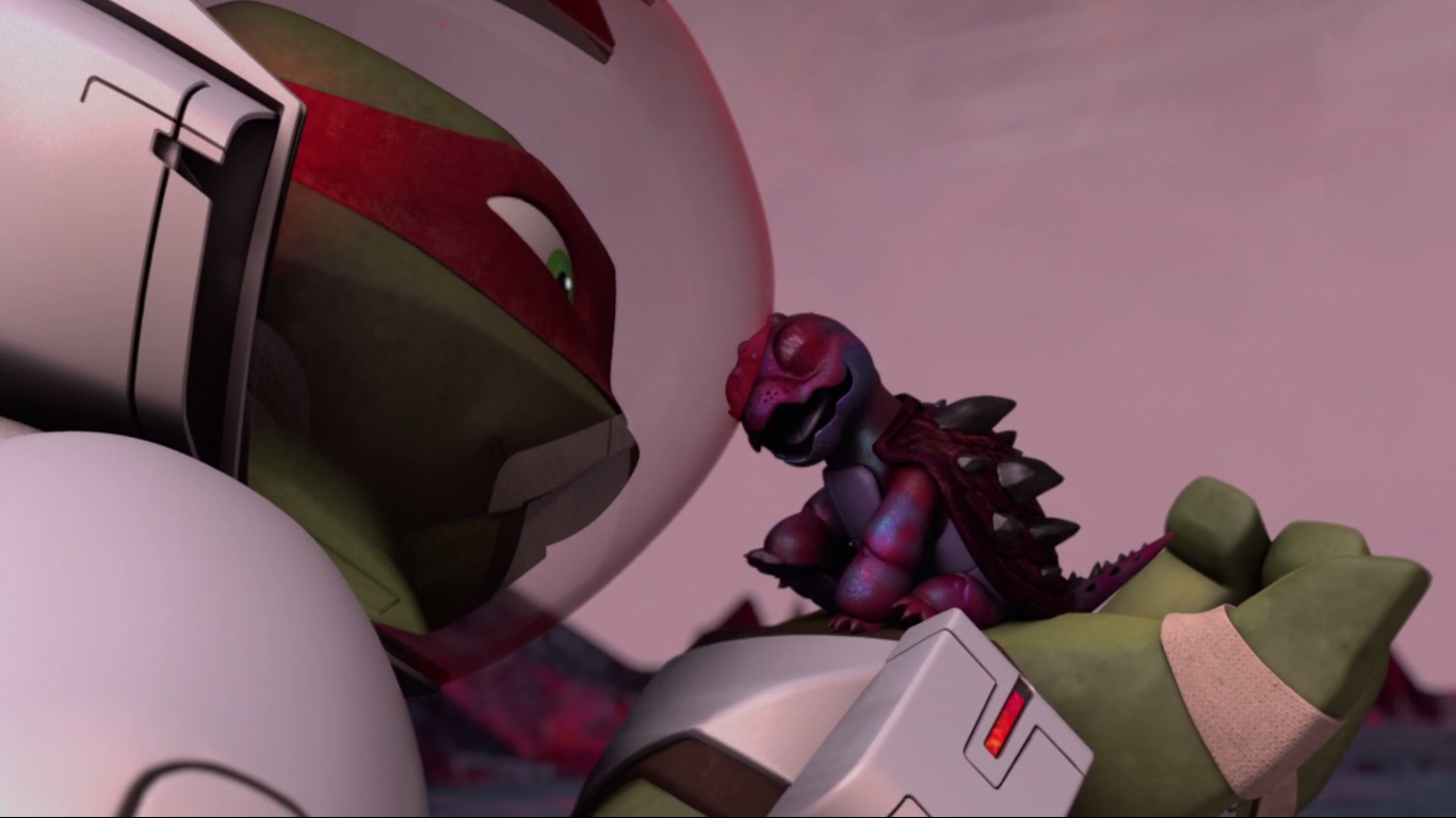 Raphael suivait le même destin. Heureusement, la tortue se rattrapait de justesse grâce à son arme, qu’il plantait dans la roche. Au moment de remonter, il tombait sur un œuf placé sur un réceptacle de roche. Le prenant dans ses mains, celui-ci se brisait, laissant apparaître une adorable petite tortue violette. Raphael se montrait immédiatement très protecteur envers la jeune créature qu’il écartait du bord de la falaise. Il décidait de le prendre avec lui en attendant de retrouver sa mère. La créature lui mordillait le doigt, il décidait donc de l’appeler Chompy Picasso (Pince-moiVF). De retour à la surface, les autres tortues se montraient plutôt sceptiques quant à l’adoption de la petite tortue de l’espace, surtout Leonardo qui voulait se concentrer sur leur mission. Le destin de la Terre et de ses habitants en dépendait !