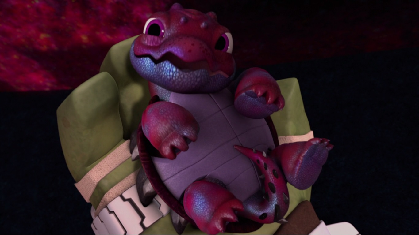 Touchée par les tirs triceratons, Tokka lâchait Chompy dans le vide. Raphael, témoin de la scène, se jetait à sa rescousse avec son grappin. Il déposait la petite tortue dans une cavité de sa mère avant de retrouver ses frères. Les tortues atteignaient enfin le générateur, qu’elles poussaient de toutes leurs forces pour l’en extraire. Celui-ci basculait et tombait dans le vide à son tour. Alors que tous le croyaient perdu dans la lave, le fragment était arrêté de justesse par le rayon tracteur de l’Ulixes, de nouveau opérationnel. Au moment de ramener le fragment au vaisseau, celui-ci était récupéré par l’Hornetron de Dregg qui quittait au plus vite cette planète infernale. Tous le suivaient, y compris Tokka, qui allumait des réacteurs situés sur le bas de sa carapace.