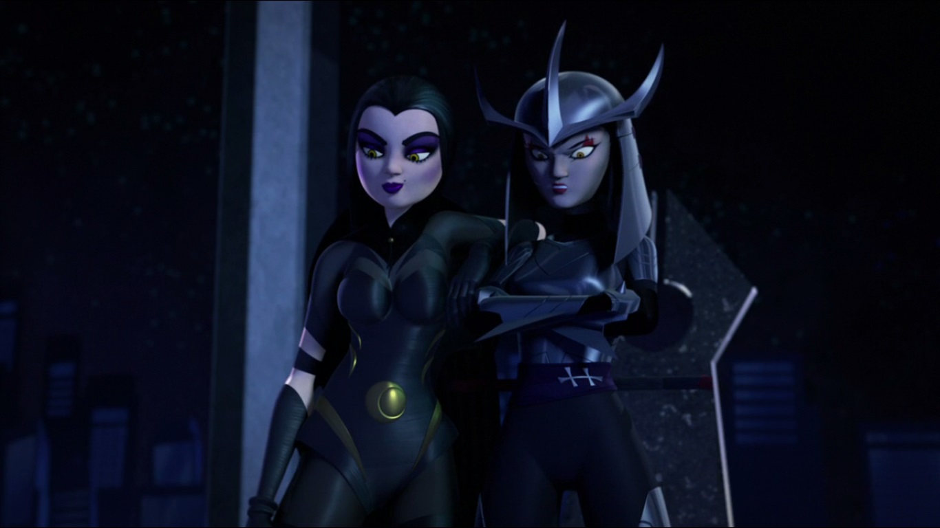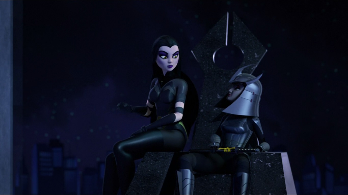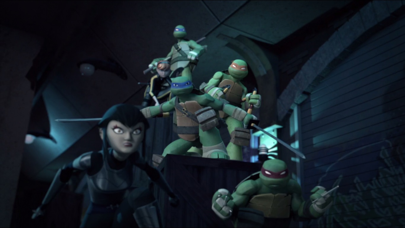 Les deux jeunes femmes étaient toutes les deux ligotées, les pieds au-dessus du sol. Le tigre retenait ses acolytes de les tuer car il savait que Karai avait demandé de l’aide à ses amis. Ce n’était plus qu’une question de temps pour les voir débarquer. Loin de vouloir rester les bras croisés, Karai se défaisait de ses liens à l’aide d’une lame cachée dans sa botte avant d’envoyer Fishface une nouvelle fois au tapis.