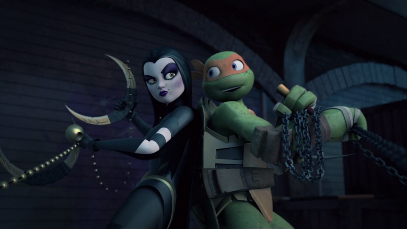Pour fêter cet évènement, les tortues et April partaient sur les toits de la ville faire une petite ronde de nuit. Les rues étaient calmes et les adolescents espéraient que cela dure après tous les évènements traversés récemment. La kunoichi n’était pas si sereine car elle ressentait une présence étrange. Soudain, Michelangelo apercevait un petit chat noir, qui filait se cacher derrière un château d’eau. Immédiatement après, le toit sur lequel ils se tenaient se retrouvait gagné par une curieuse brume et une silhouette se dessinait. Il s’agissait d’une femme munie d’un chapeau et d’une cape qui se faisait appeler Shinigami. Un combat s’engageait immédiatement. Les tortues et April ne faisaient pas long feu face à la nouvelle venue. La sorcière perdait son chapeau au cours de la bataille, laissant son visage à découvert. Michelangelo tombait instantanément amoureux de l’habile combattante. Elle le saisissait de son kusarigama et le lançait sur ses frères. April, insensible à ses charmes, cherchait à la combattre en duel singulier, en vain. Forte d’années d’entraînement, Shinigami se défaisait de son adversaire et lui dérobait son tantō, non sans en comprendre sa signification. Une belle prise se disait-elle avant de disparaître.