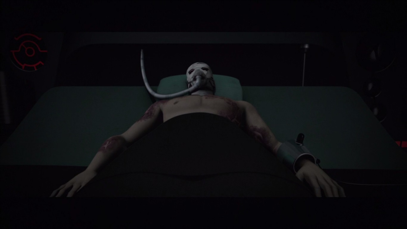 Tiger Claw revenait dans le nouveau repaire du Foot Clan, dans une villa en bord de falaise. Il se rendait de suite dans les appartements de Shredder, réduits en une chambre où Saki était allongé sur son lit. Son visage était bandé et des appareils l’aidaient à respirer. Ignorant s’il pouvait l’entendre, Tiger Claw lui faisait tout de même son rapport, lui expliquant que Karai avait décidé d’éradiquer le Foot Clan actuel. Elle avait commencé par leur cache d’arme, mais continuerait certainement dans un proche avenir. Shredder était éveillé et bien décidé à répondre à sa déclaration de guerre. Baxter Stockman entrait dans la pièce et se dirigeait vers lui avec une perfusion de mutagène. Le produit longeait les tubes de sonde avant de finir dans le sang d’Oroku Saki. Ses yeux