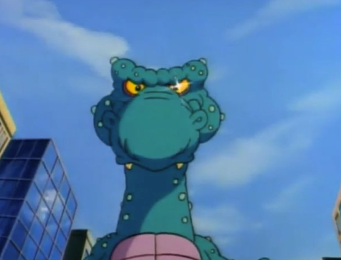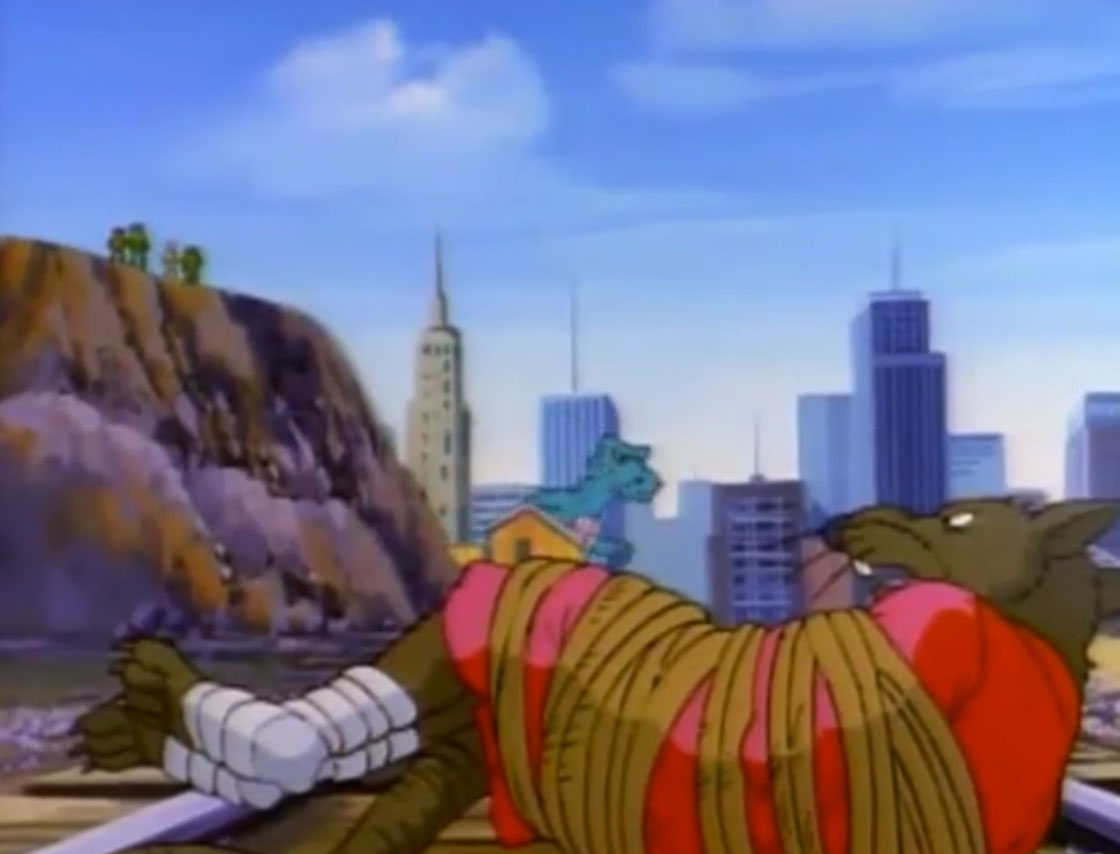 Pendant ce temps, Bebop et Rocksteady donnaient des ordres au maire. Ils voulaient que tous les jours de la semaine soient fériés, sauf le dimanche ! Soudain, ils s’arrêtaient dans leur lubie, attirés par quelque chose à la fenêtre. Au loin, ils voyaient la tête de Gorgonzola dépasser du sommet des immeubles. Pensant qu’il s’agissait d’un vrai monstre, le rhinocéros saisit l’anxiétron et partit au combat pour sauver sa ville.