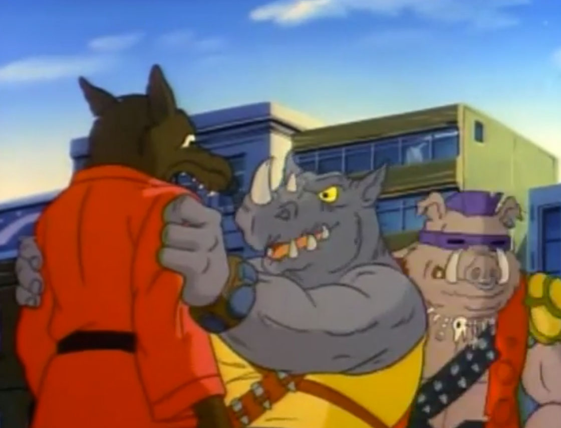Soudain, il vit une lueur dans une ruelle. Un portail interdimensionnel venait de s’ouvrir. En sortaient Bebop et Rocksteady, qui étaient chargés de dérober un appareil du nom d’anxiétron à son inventeur. Vexés de la manière avec laquelle Shredder et Krang leur donnaient des ordres, les deux mutants partaient remplir leur mission. Zach contactait immédiatement les tortues, mais il avait la désagréable surprise de se rendre compte que le réseau ne fonctionnait pas. L’adolescent suivait les deux débiles jusqu’à arriver au laboratoire du professeur. Bebop et Rocksteady s’étaient fait passer pour des scientifiques, revêtant une blouse blanche. Le phacochère saisit l’invention et l’utilisa sur son créateur. Touché par les ondes, il mourrait de peur et leur demandait de l’épargner, pourvu qu’ils prennent l’anxiétron.