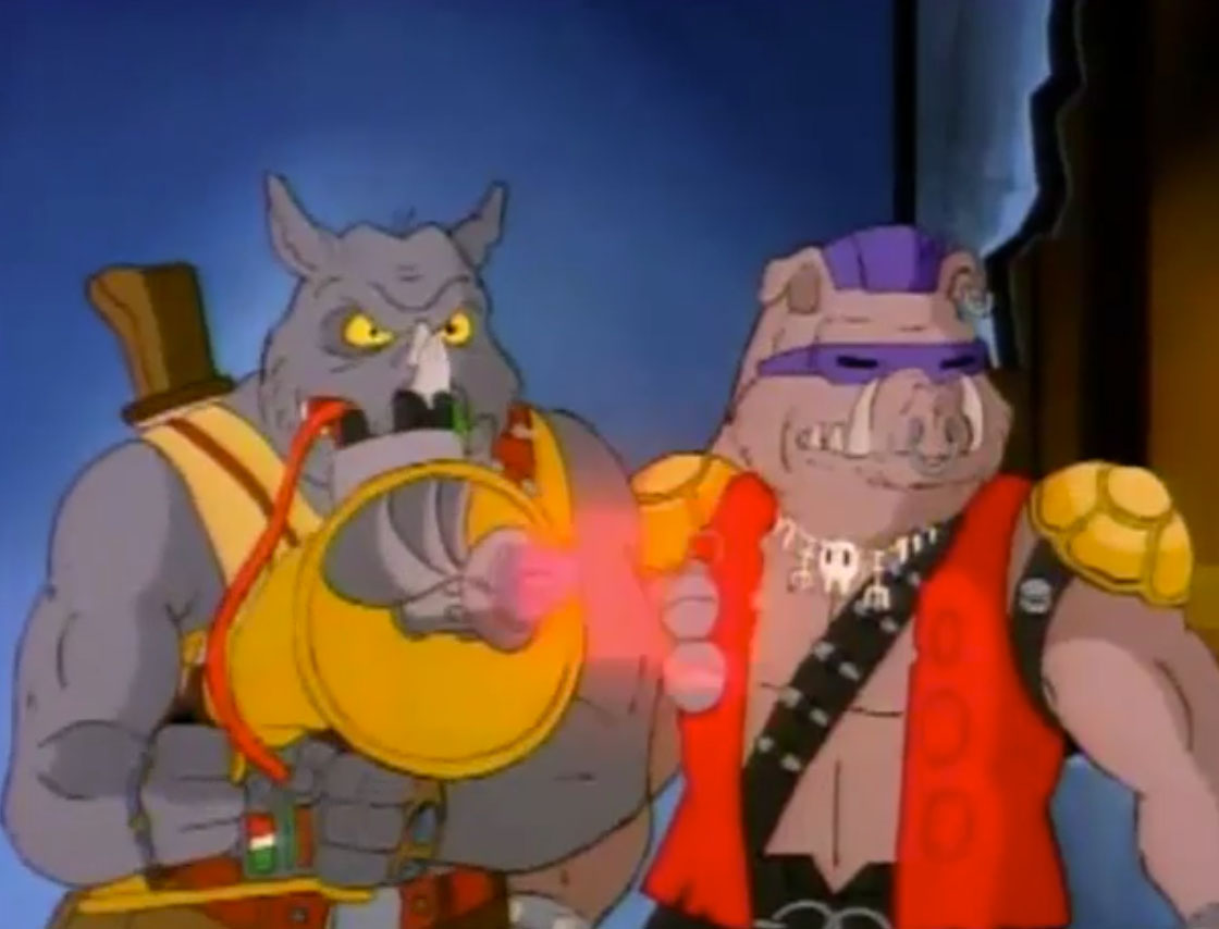 Pouvant donner si facilement la peur, l’invention montait à la tête de Bebop et de Rocksteady, qui se mettaient à l’utiliser sur un passant dans la rue. Quel plaisir ! Ils pouvaient conquérir le monde avec une telle invention ! Shredder les appelait au même moment, furieux de ne pas avoir de nouvelles. Mais ils n’avaient pas échoués cette fois. Ils avaient simplement décidé de ne plus lui obéir. Furieux d’apprendre la rébellion de ses hommes, Shredder ouvrait un portail pour les corriger. Mais le rhinocéros tira en direction de la porte lumineuse de sa nouvelle arme, infligeant une terrible crainte à leur chef et à Krang. Craintifs, ils partaient se cacher derrière une console. Ils avaient peur des soldats Foot, des ordinateurs et même des particules dans l’air !
