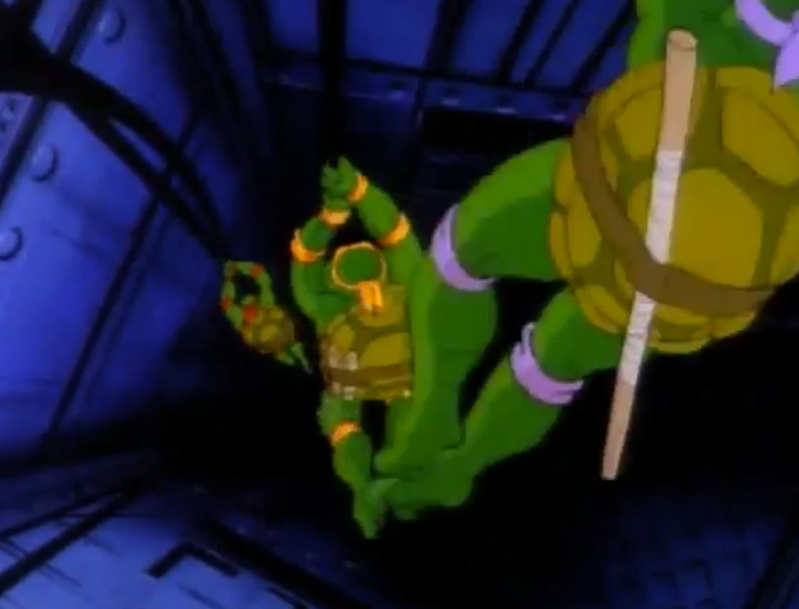 • Une image de la scène où les tortues s’échappent par les câbles de la cage d’ascenseur est reprise comme fond illustrant le générique de fin des épisodes de la saison 4, à partir de l’épisode La vengeance de la mouche (S4 E14).