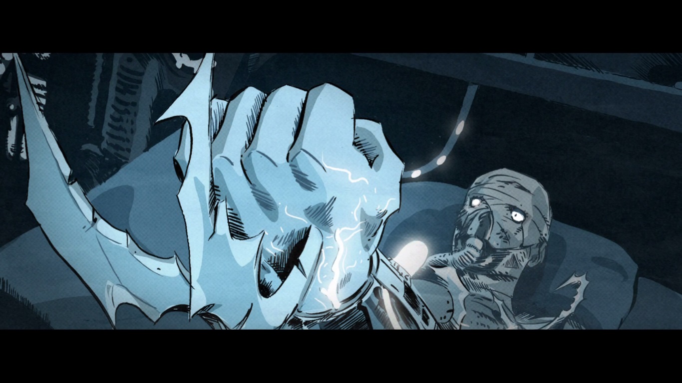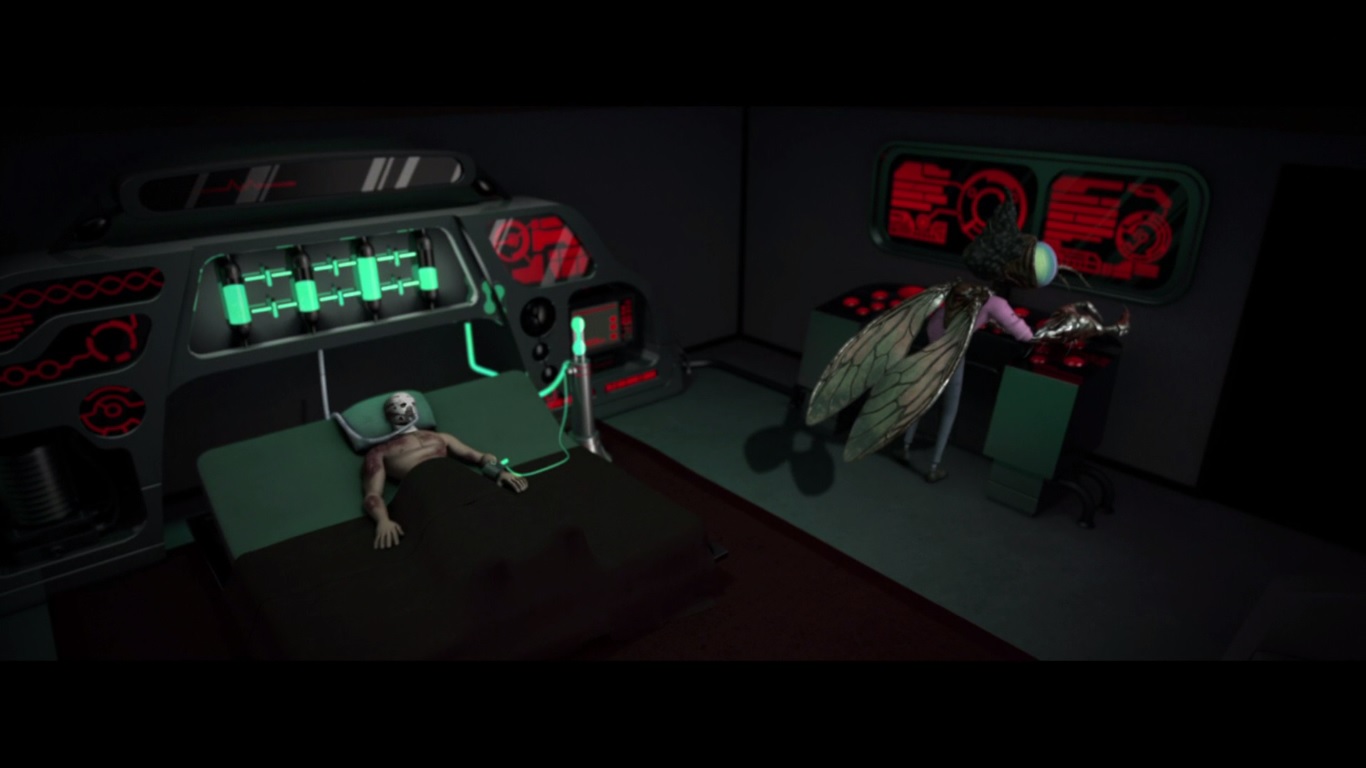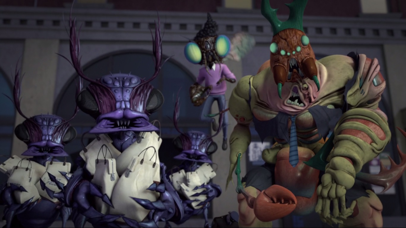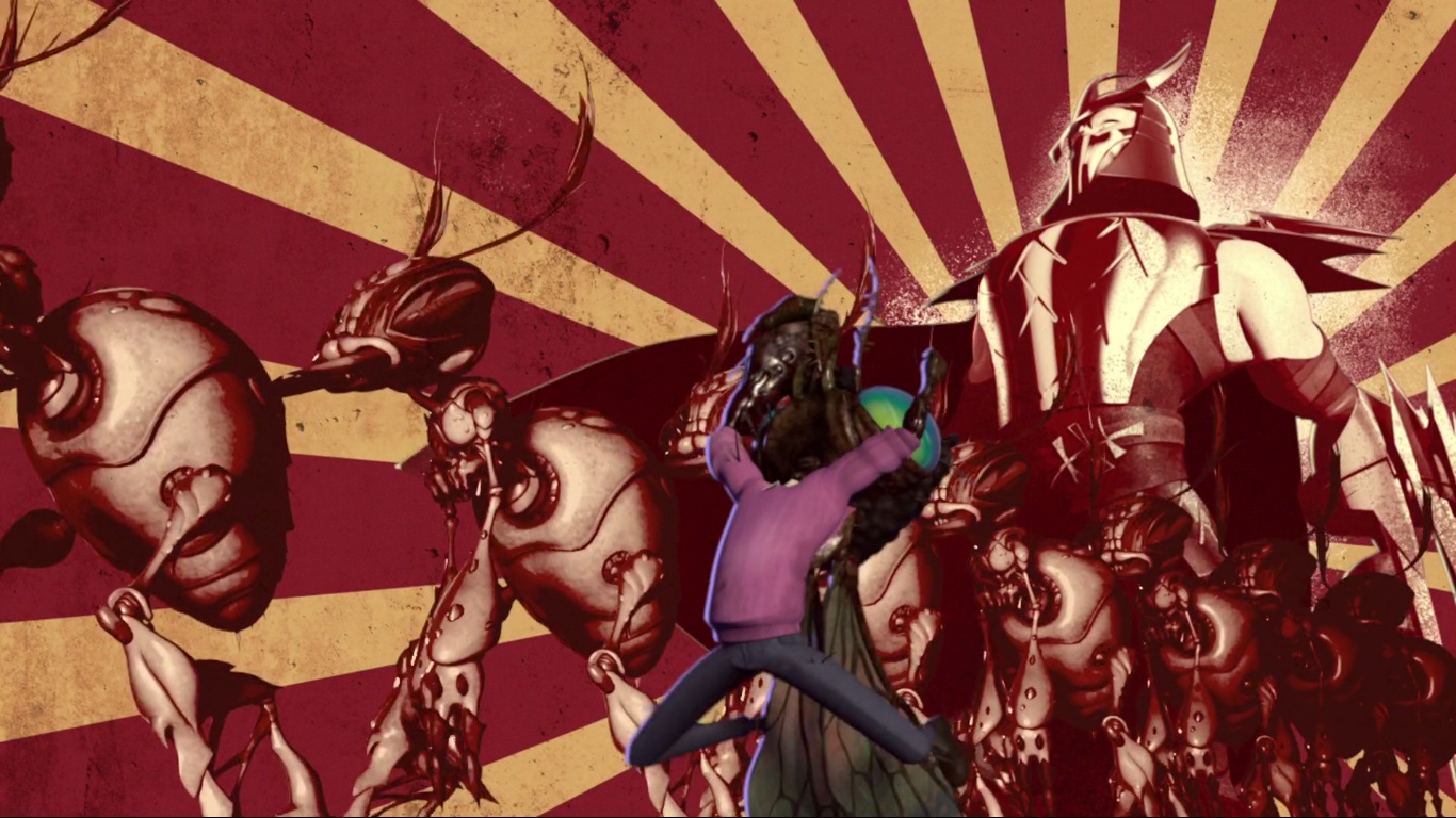 Dans le nouveau repaire du Foot Clan, Oroku Saki s’impatientait. Toujours allongé dans son lit, immobile, il attendait que le mutagène de Baxter fasse effet. L’instabilité de l’échantillon sur lequel il avait travaillé nécessitait beaucoup de précautions et le mutant préférait lui prodiguer des injections ponctuelles pour éviter des effets indésirables. Mais Shredder jouait contre le temps ; son clan se faisait démembrer, il perdait ressources et infrastructures. Ses hommes de main étaient des incapables. Face au mur, il réalisait que son seul sujet fidèle était cette mouche qu’il avait si souvent mal traitée. Malgré tout, Baxter comptait lui rester fidèle. Pas de temps à perdre, l’insecte cherchait quelques vieux plans et se mettait au travail. Il allait créer une armée d’insectes pour aider son maître.