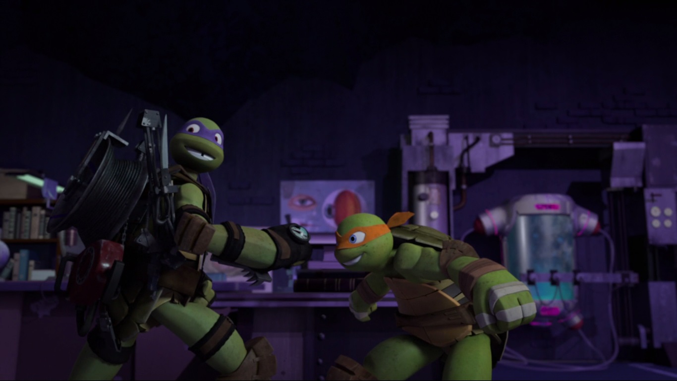 Dans son laboratoire, Donatello venait de terminer une nouvelle invention, qu’il avait commencée avant leur voyage spatial. Il s’agissait d’un lanceur de grappin adapté dans un pack dorsal de manière à pouvoir se déplacer facilement entre le sol et les airs. Ce serait certainement efficace pour lutter contre les insectes de Baxter.