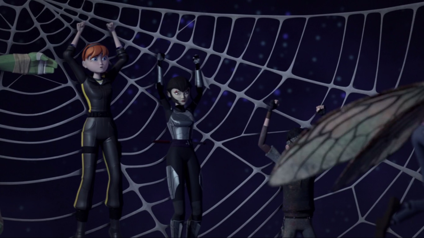 Baxter commençait à échafauder la suite de son plan. Casey était retenu dans une sorte de toile d’araignée, la tête en bas. Le second de la mouche lui signalait que les tortues risquaient d’arriver d’un instant à l’autre. Ils feraient mieux de changer de cachette. Pour la suite de son plan, le scientifique raté avait pour intention d’arrêter Karai. Ils se rendaient donc dans son repaire.La jeune femme était surprise dans la salle du trône par les armées de fourmi. Stockman et Scumbug lui barraient la route depuis la porte d’entrée, jetant ses ninjas neutralisés au sol. La femme se jetait sur l’homme de main de Shredder, mais se faisait arrêter par le nouveau mutant et accrocher au plafond par plusieurs fils de toile. Au même moment, les tortues arrivaient pour livrer bataille aux fourmis de Baxter – Antrax comme les avait nommées Michelangelo. Raphael ne savait plus quoi faire et se retrouvait de nouveau pris dans des visions peu rassurantes de Dregg et de ses Vreens, puis de Mona Lisa qu’il partait délivrer. Sains et saufs, ils s’embrassaient langoureusement… Son réveil était brutal, puisqu’en réalité yeux, la tortue embrassait l’une des fourmis. Il ne restait plus que Donatello et Michelangelo. Karai, April et Leonardo avaient été enlevés.