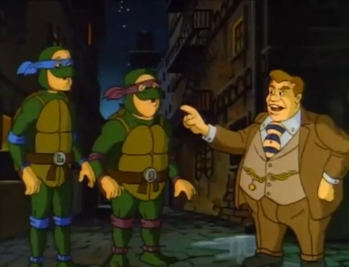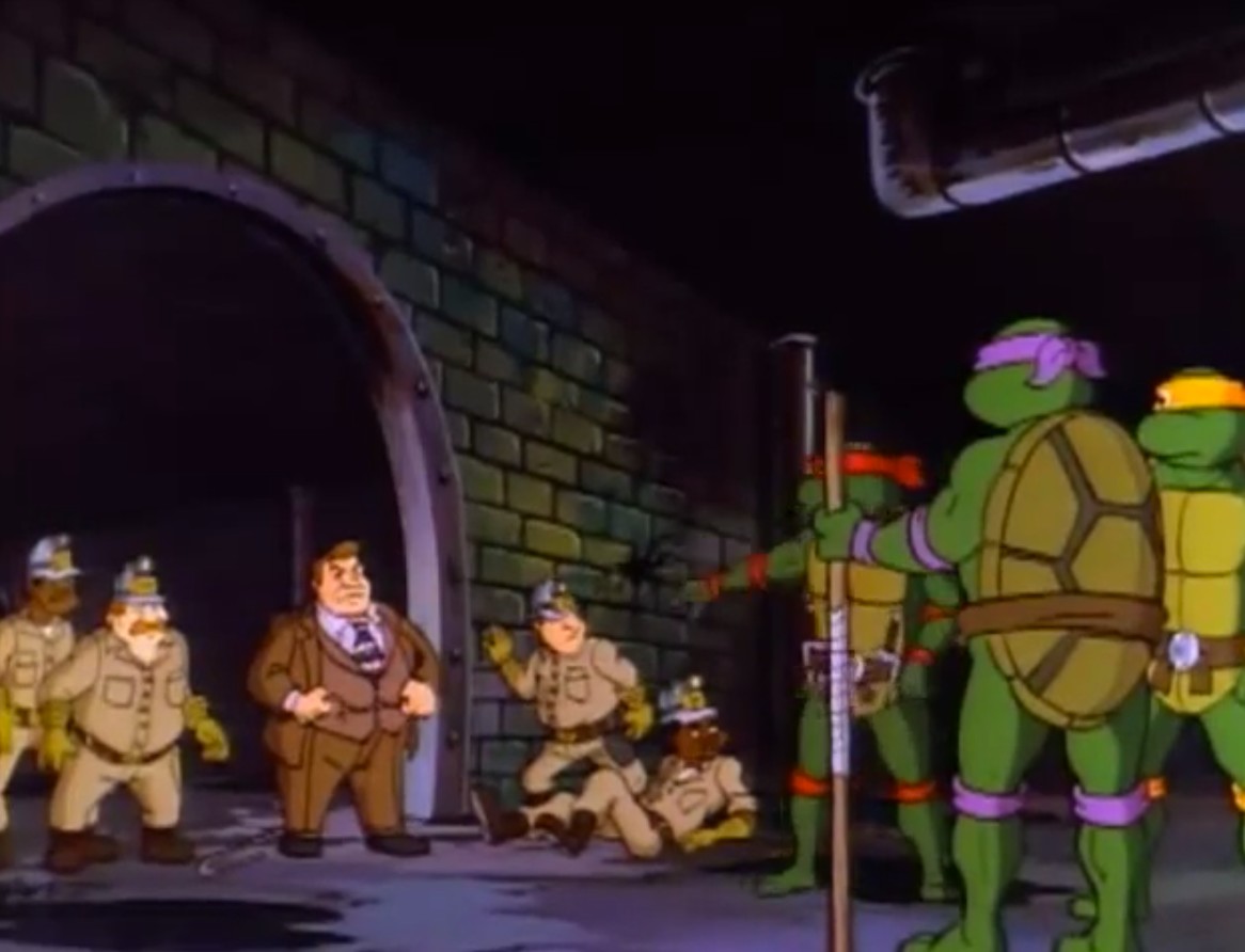 prévenu ses frères que des hommes faisaient des travaux, sans doute illégaux, dans les égouts. Les tortues étaient sceptiques, mais ne tardaient pas à trouver des ouvriers, sous les ordres de l’actionnaire Fenton Hackenbush. Leonardo, dégainant son sabre, menaçait l’homme d’affaire s’il ne partait pas. S’il voulait ces travaux, il aurait besoin d’une autorisation de son supérieur, Donald J. Lofty.