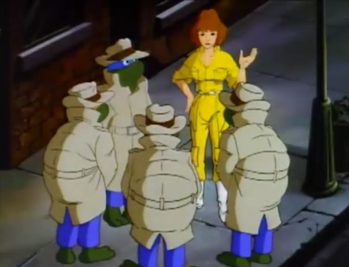 Attendant ses amis, qui avaient des informations compromettantes à lui révéler sur Hackenbush, April vit une tortue entrer dans la pizzeria. Ne portant pas de bandeau comme d’habitude, elle était incapable de savoir lequel des quatre frères il s’agissait. Pire encore, la tortue se jetait sur les pizzas, dont l’odeur l’avait attirée. Il s’agissait de Slash, qui après avoir dévoré toutes les pizzas, se lançait à la poursuite de la journaliste, qu’il emprisonnait dans sa fourgonnette. Il ne lui restait plus qu’à s’attaquer à la cloche.