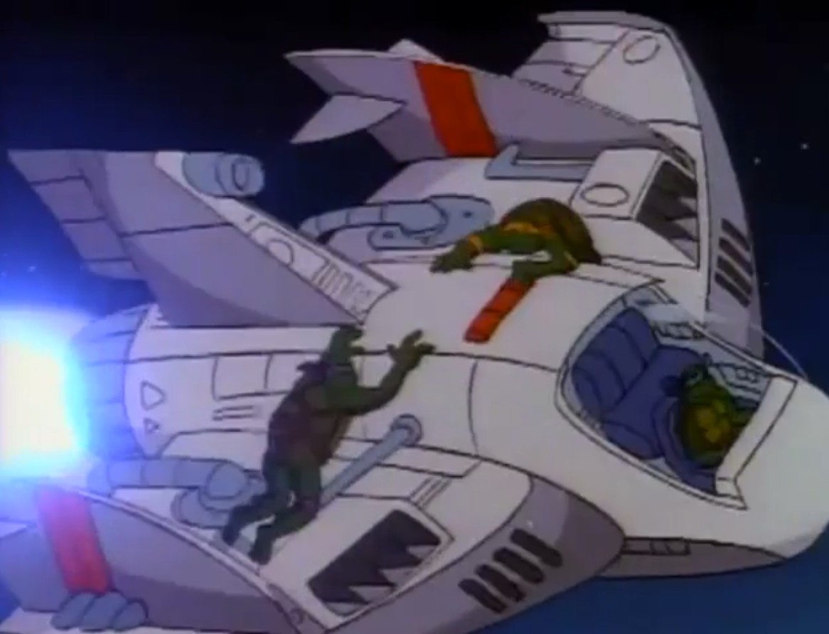 Donald Lofty arrivait au même instant sur le site de lancement, demandant à Hackenbush ce qu’il se passait. L’homme mal à l’aise niait les faits. La fusée venait d’être lancée et gagnait les airs. Le vaisseau piloté par les tortues arrivait à son niveau, prêt à l’abordage. Donatello et Michaelangelo montaient à bord du vaisseau pour arrêter Slash. Rien à faire et pire encore, la tortue avait détruit la console de l’appareil, qui se dirigeait à présent vers l’espace. Les ninjas sortaient à temps, récupérés dans les airs par leurs frères.
