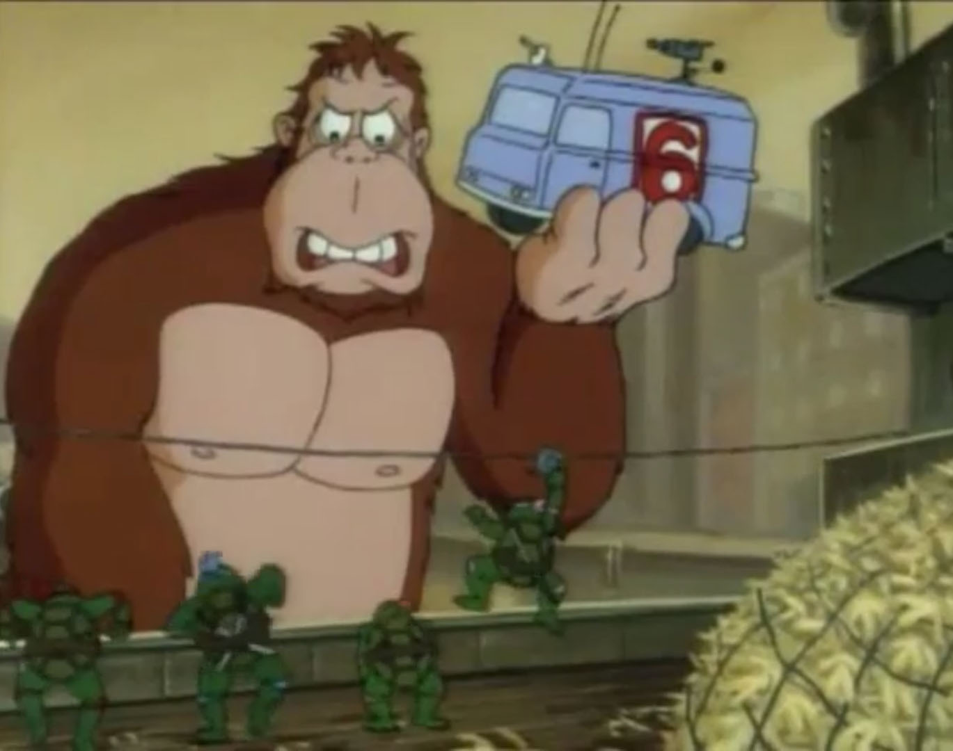 Pire encore, dans son laboratoire, le professeur relisait ses notes. Il se rendait compte qu’il n’avait commis aucune erreur. Et que Jocko devrait devenir à son tour. Il ne croyait pas si bien dire, au même moment, le primate brisait sa cage tant il avait grandi. Atteignant plus de neuf mètres de haut, il brisait le mur du laboratoire pour gagner sa liberté. Quelques minutes plus tard, la ville était transformée en jungle. April couvrait l’évènement, accompagnée de Vernon à la caméra. Elle apercevait Jocko, qui n’avait clairement plus l’air aussi sympathique. Les tortues arrivaient au même moment pour voir ce qu’elles pouvaient faire en ville. La vue du singe les déconcertait, elles ne s’attendaient pas à ça.
