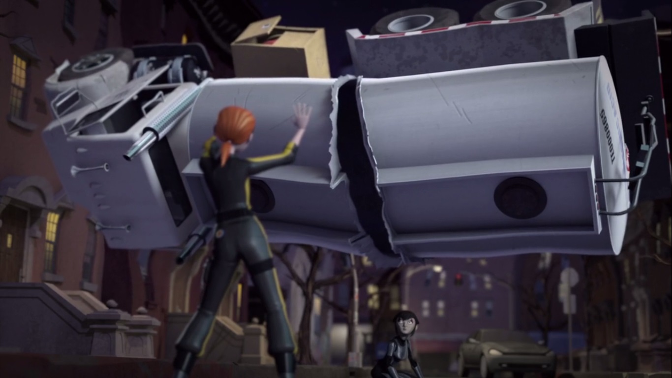 Dans les rues de New York, Karai et April unissaient leurs forces contre Super Shredder. Le mutant se débarrassait de la première avant de s’attaquer à la seconde. De ses pouvoirs, la jeune femme le repoussait vers un carrefour, où il était percuté par un camion-citerne. Le véhicule explosait au contact de la façade d’une maison. Mais il en faudrait plus pour en finir avec le colosse qui soulevait la citerne du camion avant de la lancer en direction de ses adversaires.
