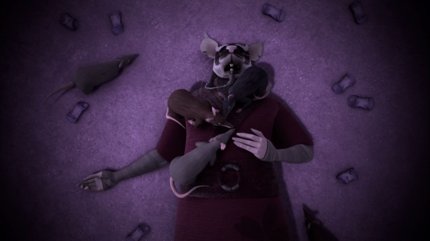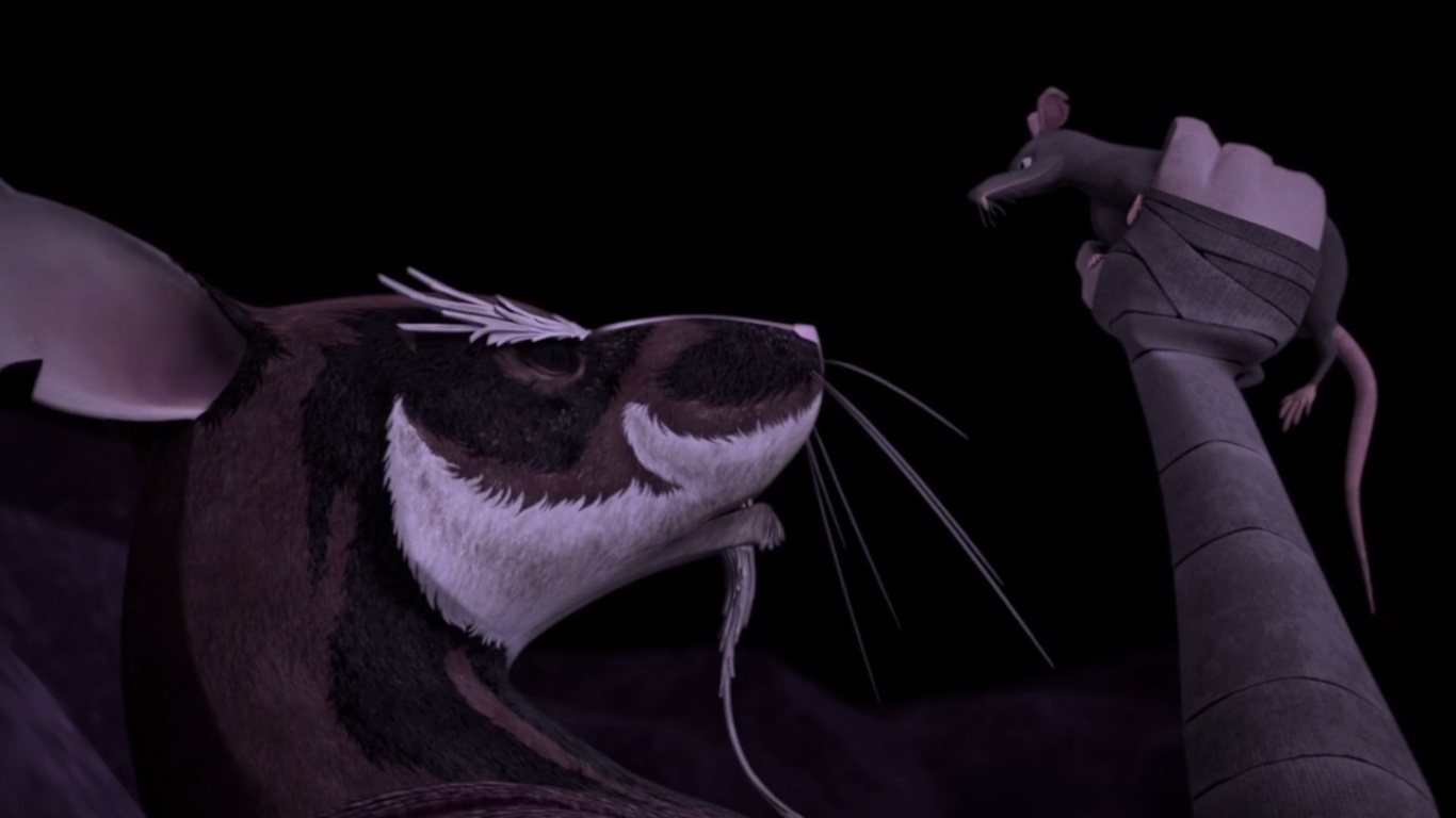 Splinter continuait de perdre la tête face au Rat King et à son monstre composé de centaines de rongeurs. Il essayait encore de lui échapper et se dirigeait vers une poutrelle. Celle-ci aboutissait vers un nouveau trou. La créature l’écrasait. Dans la douleur, le mutant eut une vision, revoyant Michelangelo présentant un gâteau pour leur anniversaire de mutation (L’apparition des tortues, S1 E1). Il voyait alors Tang Shen à l’arrière de la cuisine où se déroulait la scène. La vue de sa bien-aimée lui faisait reprendre une bonne fois pour toutes ses esprits. Il relevait la tête et donnait un coup dans le monstre avant de chuter de la poutrelle. Le rongeur glissait dans un trou et se retrouvait nez à nez avec le squelette du Rat King. La fièvre l’avait fait délirer. Il savait que son vieil ennemi était tombé là. Son inconscient avait tenté de le faire redevenir un animal, comme auparavant (Retour à New York, S3 E9).