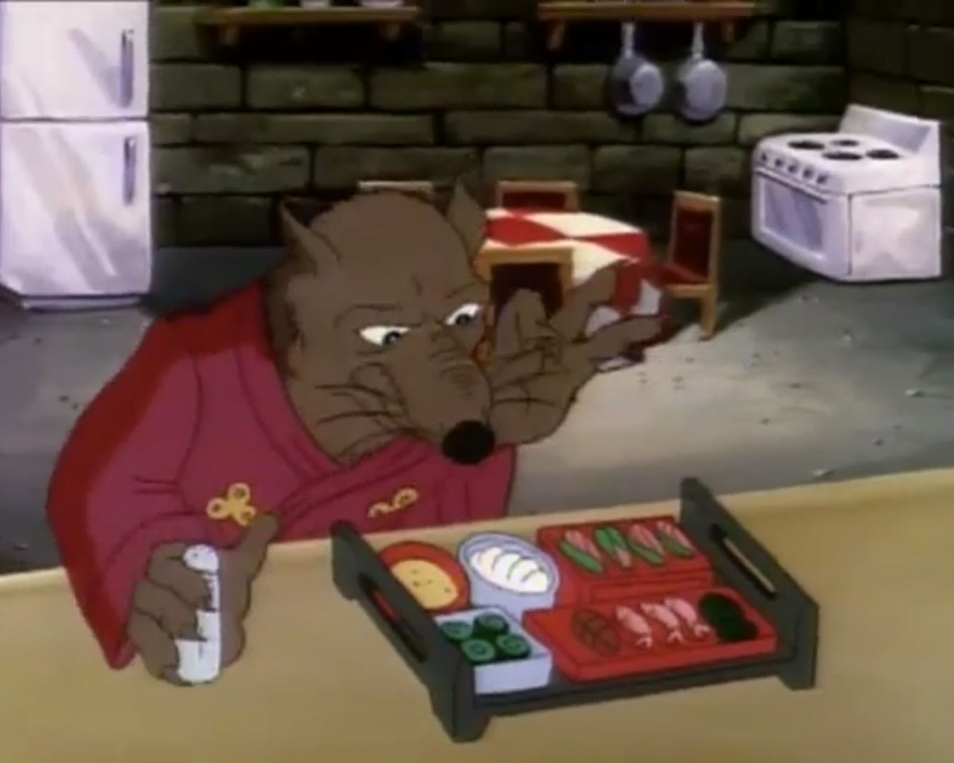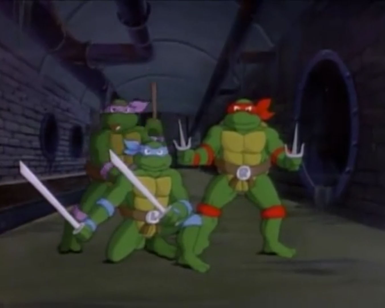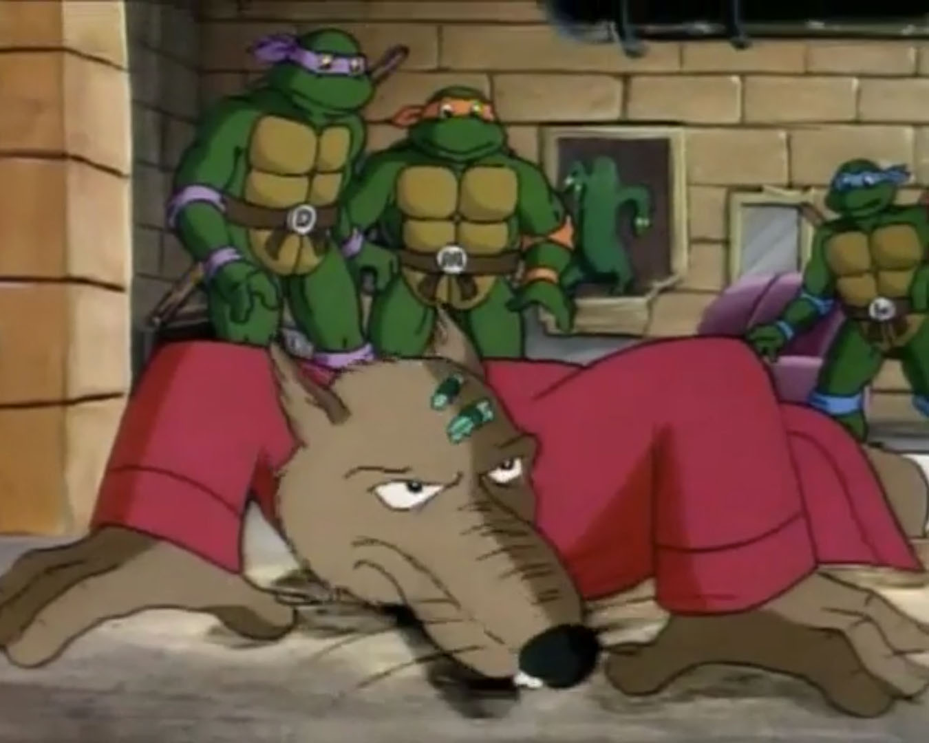 Dans le repaire, les tortues étaient sur le qui-vive. Prêtes à attaquer à tout moment, cachées au plafond entre deux tuyaux ou derrière le canapé, elles sautaient sur leur maître qui venait de se préparer une assiette de sushis. Le rat habile esquivait chacune des attaques, jusqu’à renverser des pizzas qui trainaient sur la table basse. Mais finalement, la part du succulent met italien avait raison de lui. Il glissait dessus et renversait son repas. Pourquoi un tel remue-ménage ? Les jeunes s’entraînaient un petit peu plus. Le rat était hors de lui. Pourquoi s’entraîner ailleurs que dans le dojo ? Qui plus est dans le salon ? Les quatre frères étaient jetés dehors.