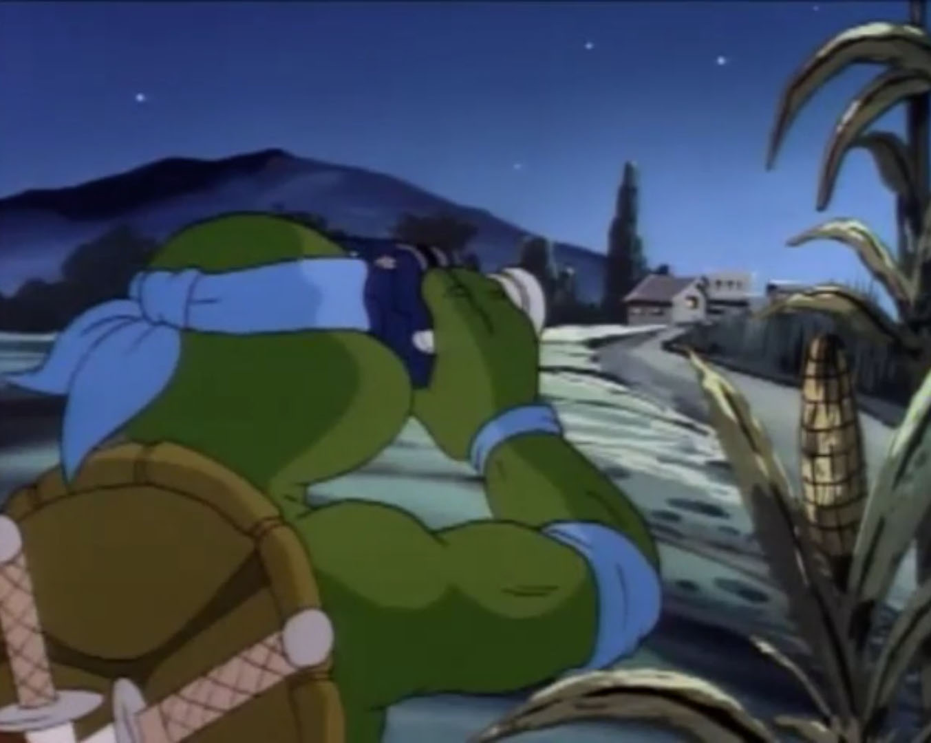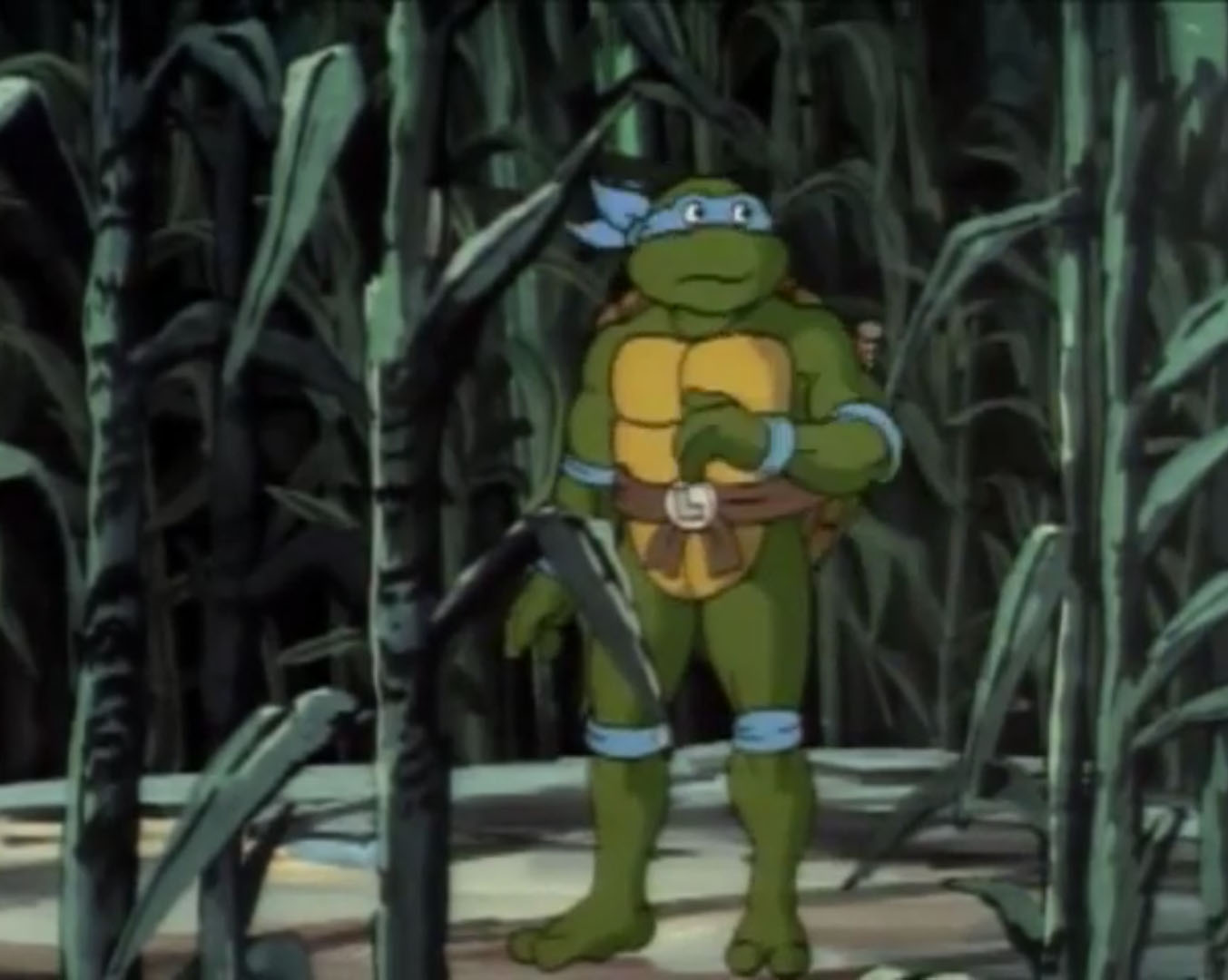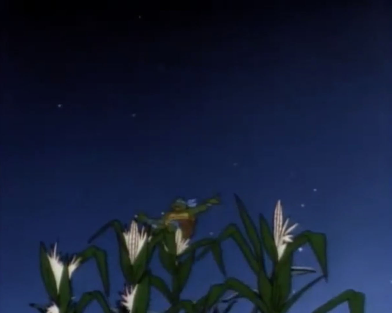 De retour de la pizzeria, les trois autres frères étaient étonnés de ne pas voir Leonardo dans le repaire. Cela faisait un bon moment que le jeune mutant s’en était allé. Il tournait justement en rond dans le champ d’épis de maïs et ne parvenait même plus à se concentrer pour réfléchir. Soudain, il entendit un bruit dans le ciel. Il voyait un étrange appareil, comme un hélicoptère, mais qui changeait de direction sa guise. Un OVNI ? Il suivait cette étrange chose dans le ciel.
