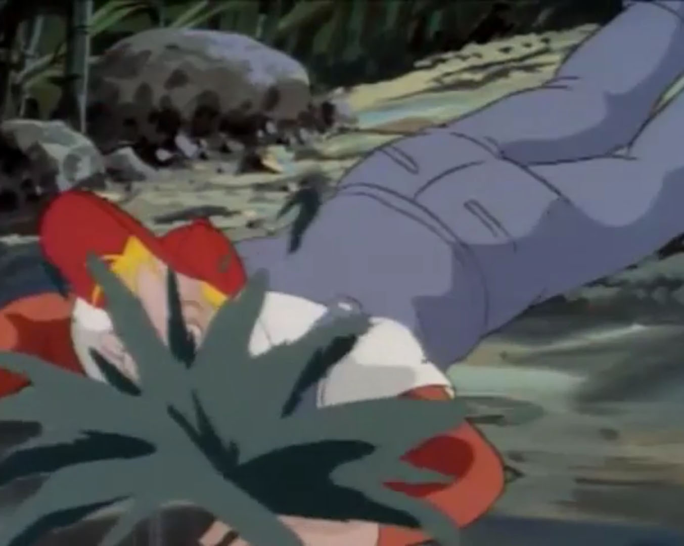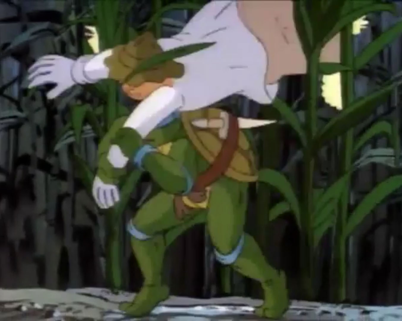 Au même moment, un homme du village voisin qui pêchait au bord de la rivière apercevait cet appareil et le suivait. Il s’engouffrait à son tour dans le champ de maïs et s’entrechoquait avec Leonardo. L’humain tombait, tête la première, dans une flaque de boue. À la vue de ce petit homme vert, il prenait la fuite. La tortue en faisait de même. Son visage caché derrière la boue, il prenait également l’individu pour un extraterrestre visqueux, grand et fort. La tortue se jetait dans une rivière à proximité.