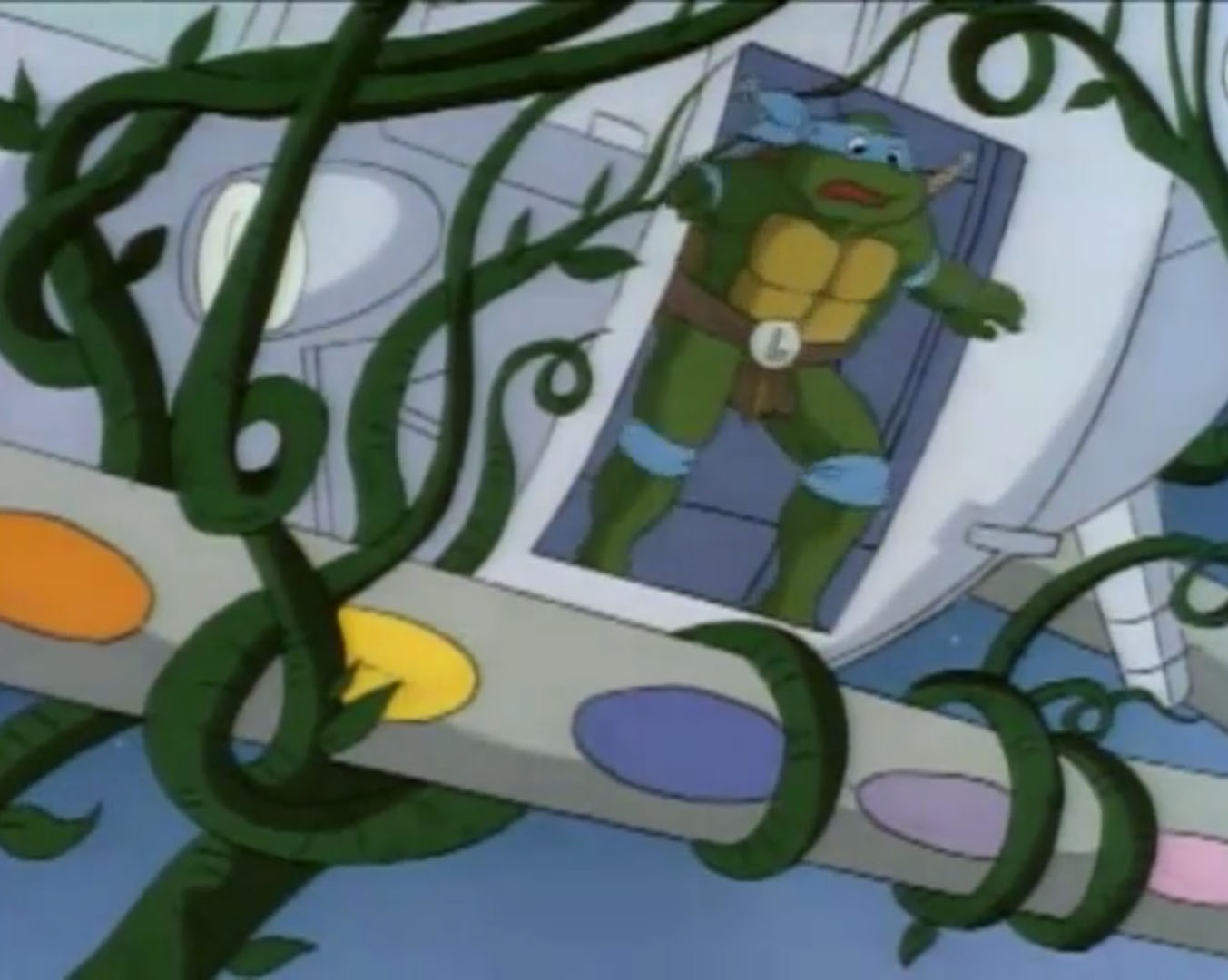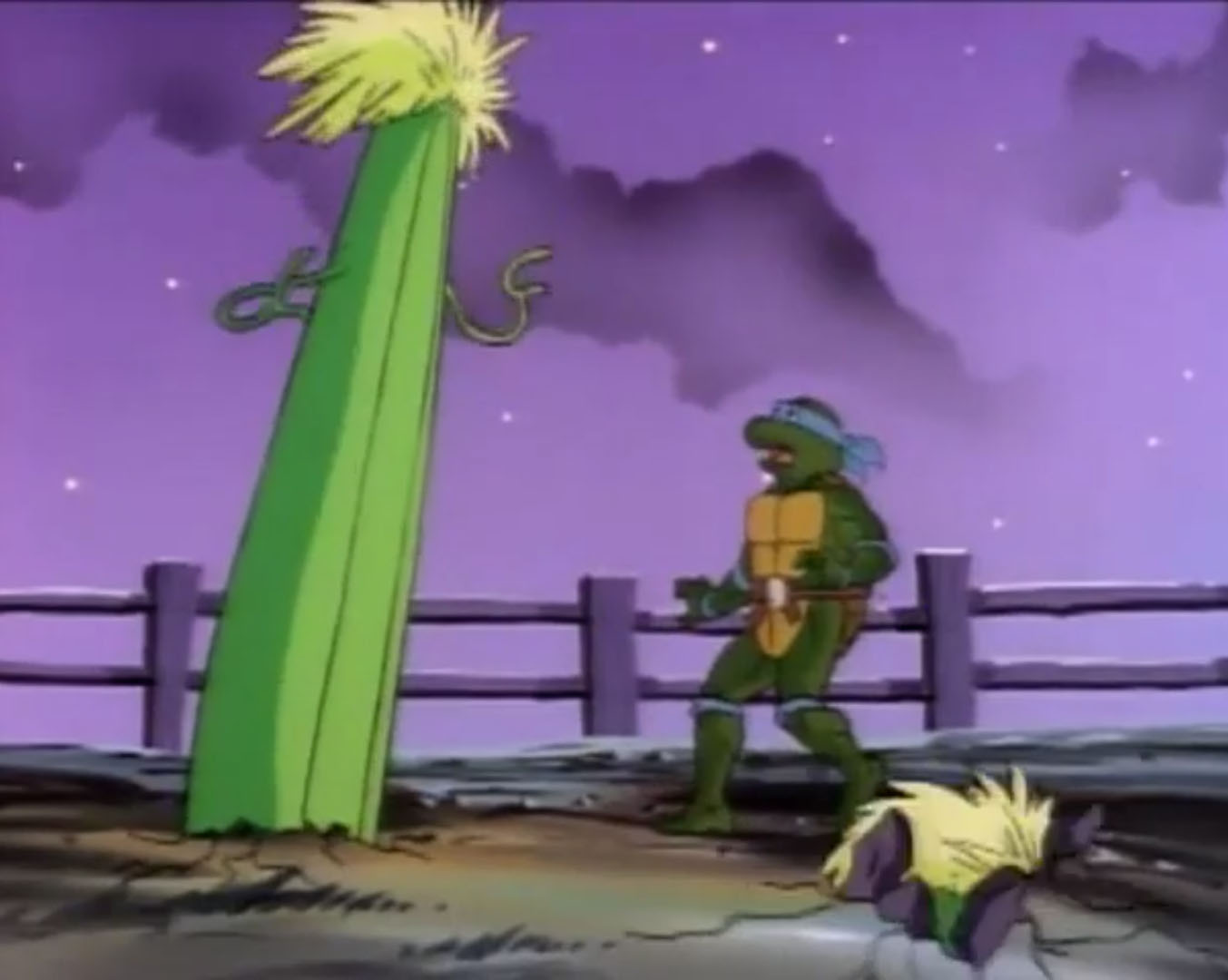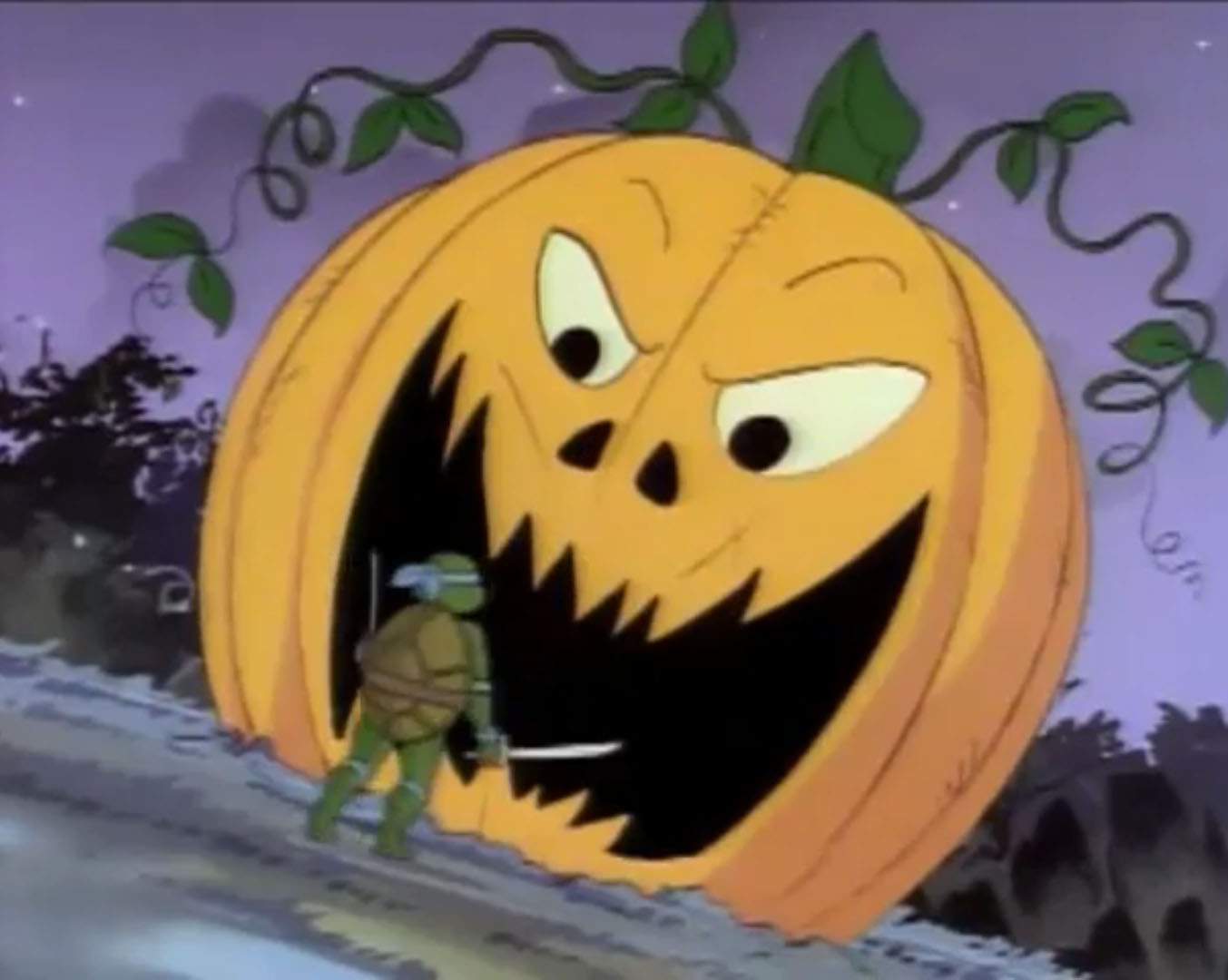 La tortue repartait à pied vers la nationale pour retrouver April et élaborer un plan. Soudain, Leonardo était arrêté par des plantes qui sortaient du sol. D’immenses épis de maïs avec des jambes et des bras se lançaient à sa poursuite. Il leur échappait en se cachant derrière un arbre. Il manquait de se faire écraser par des pois géants. Puis un autre plant de maïs le saisissait pour le jeter au sol plusieurs mètres plus loin. Se relevant, la tortue voyait un potiron pousser à vue d’œil devant elle. Saisissant ses sabres, il le tranchait. La cucurbitacée avait l’air d’une citrouille d’Halloween. Un vrai cauchemar !