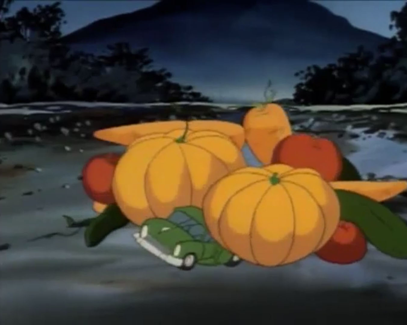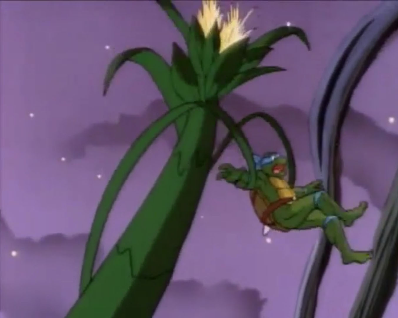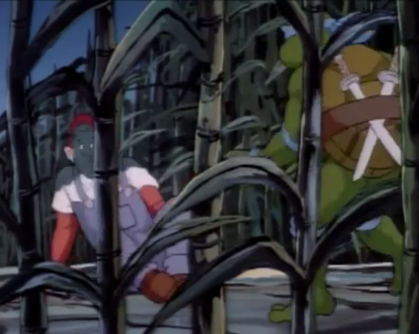 La tortue repartait à pied vers la nationale pour retrouver April et élaborer un plan. Soudain, Leonardo était arrêté par des plantes qui sortaient du sol. D’immenses épis de maïs avec des jambes et des bras se lançaient à sa poursuite. Il leur échappait en se cachant derrière un arbre. Il manquait de se faire écraser par des pois géants. Puis un autre plant de maïs le saisissait pour le jeter au sol plusieurs mètres plus loin. Se relevant, la tortue voyait un potiron pousser à vue d’œil devant elle. Saisissant ses sabres, il le tranchait. La cucurbitacée avait l’air d’une citrouille d’Halloween. Un vrai cauchemar !