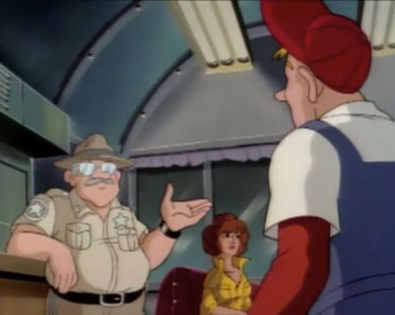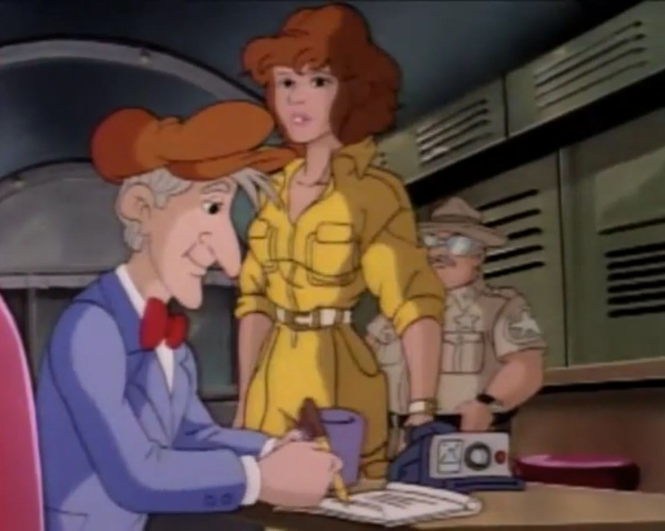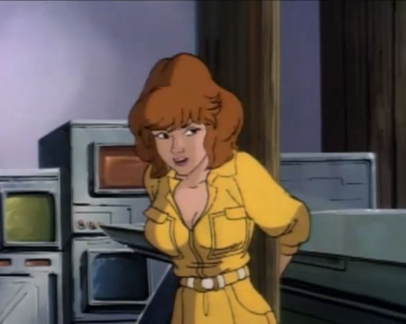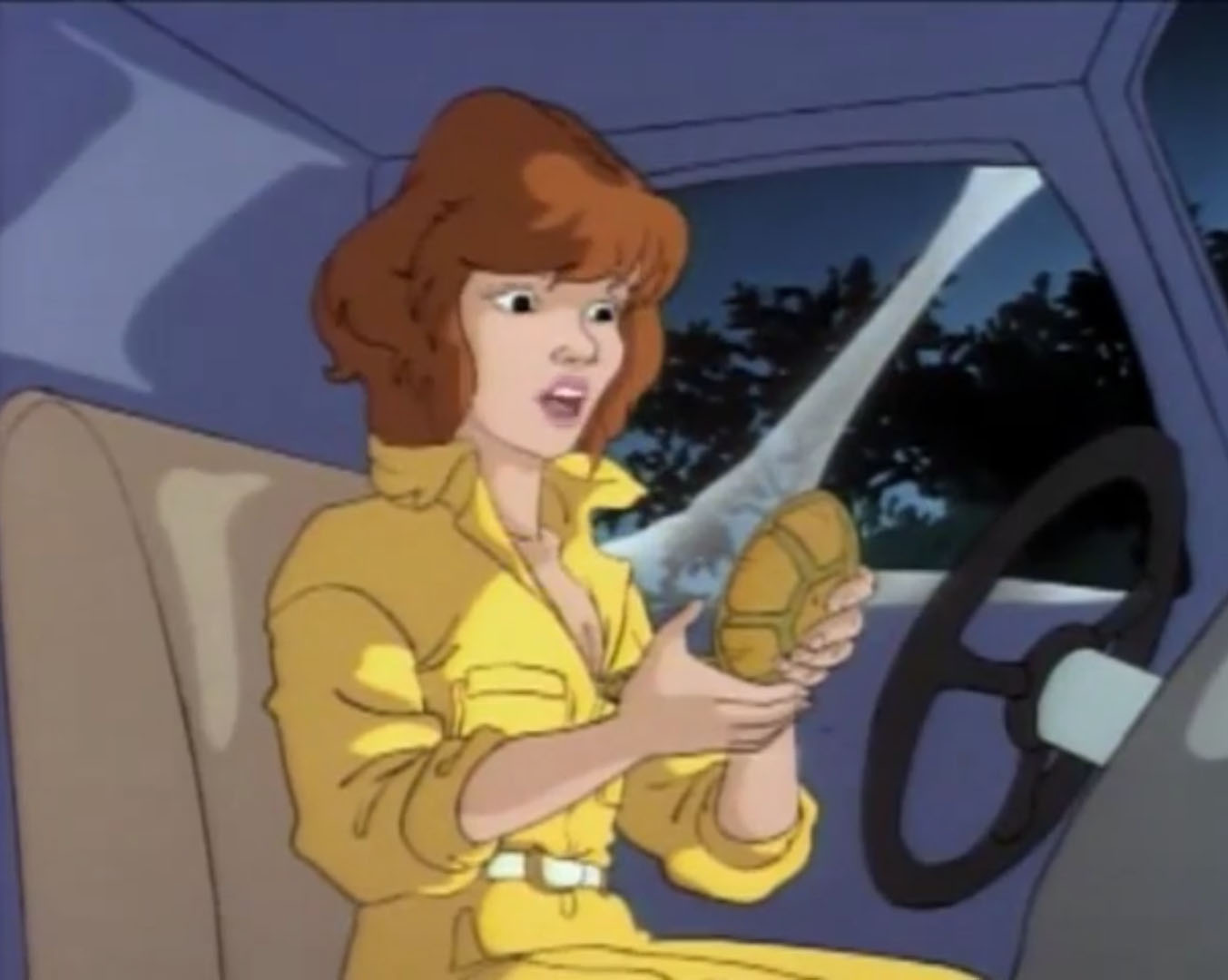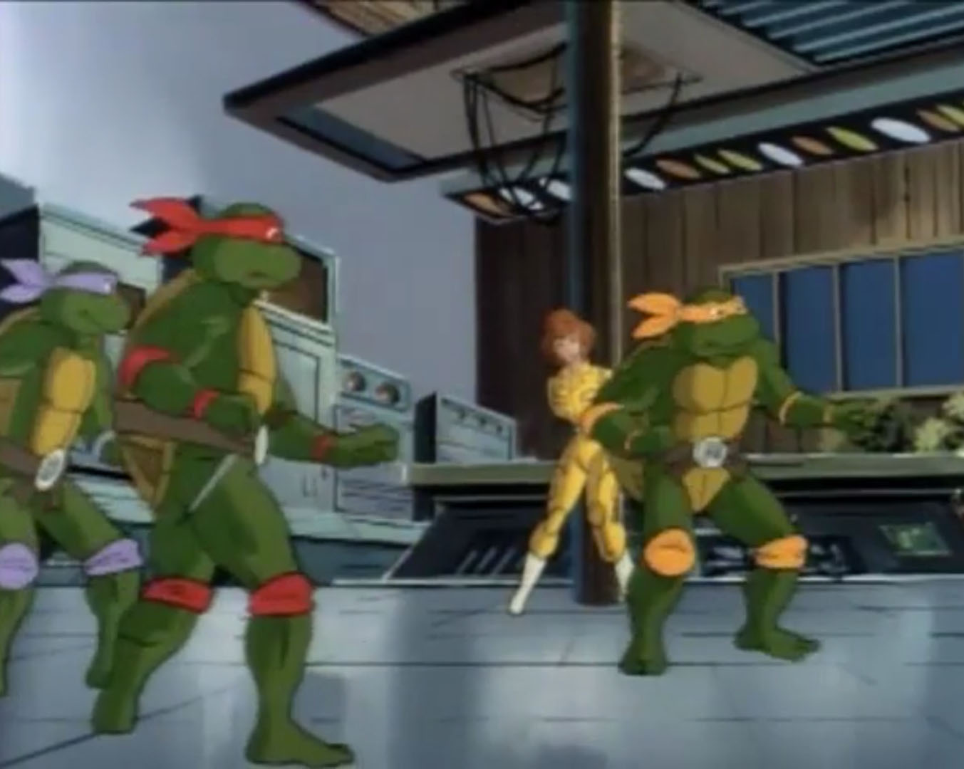 La journaliste essayait justement de convaincre son rédacteur en chef de mener une enquête sur l’apparition d’OVNI. Thompson était plus que sceptique, il savait que ce genre d’informations faisait vendre. Mais n’aboutissaient souvent nulle part. Toutefois, sa journaliste vedette avait un bon tuyau avec un informateur qui se trouvait dans un village à quelques dizaines de kilomètres de New York. Elle voulait creuser la piste. Alors que la jeune femme quittait le bureau de son supérieur, elle recevait l’appel de Leonardo. Ne pouvant rejoindre ses amis, elle lui expliquait sur quoi porterait son nouveau reportage. Son rendez-vous était très important et devait partir sur le champ. Splinter, qui avait entendu la réponse de leur amie, avait un mauvais pressentiment. Leonardo se levait sur le champ, annonçant qu’il veillerait sur elle. Les autres tortues resteraient au repaire pour suivre le documentaire sur le contreplaqué.
