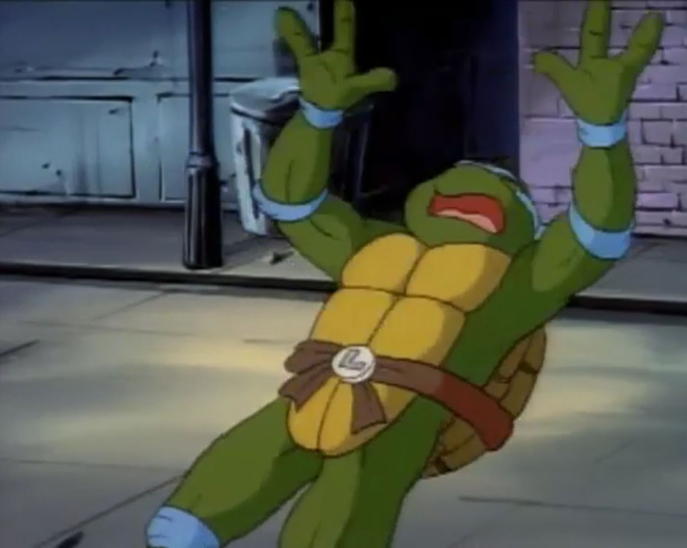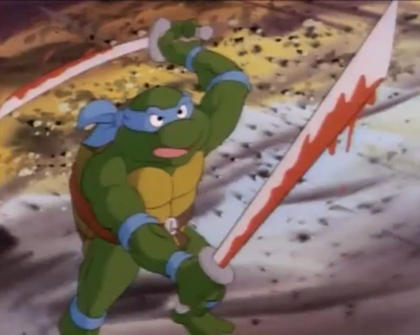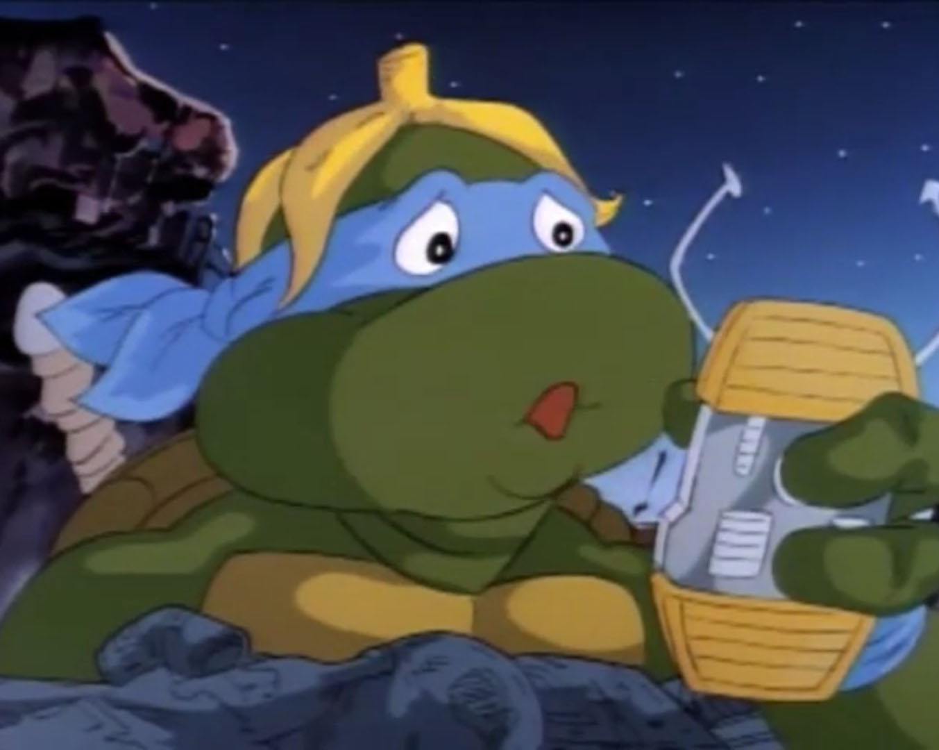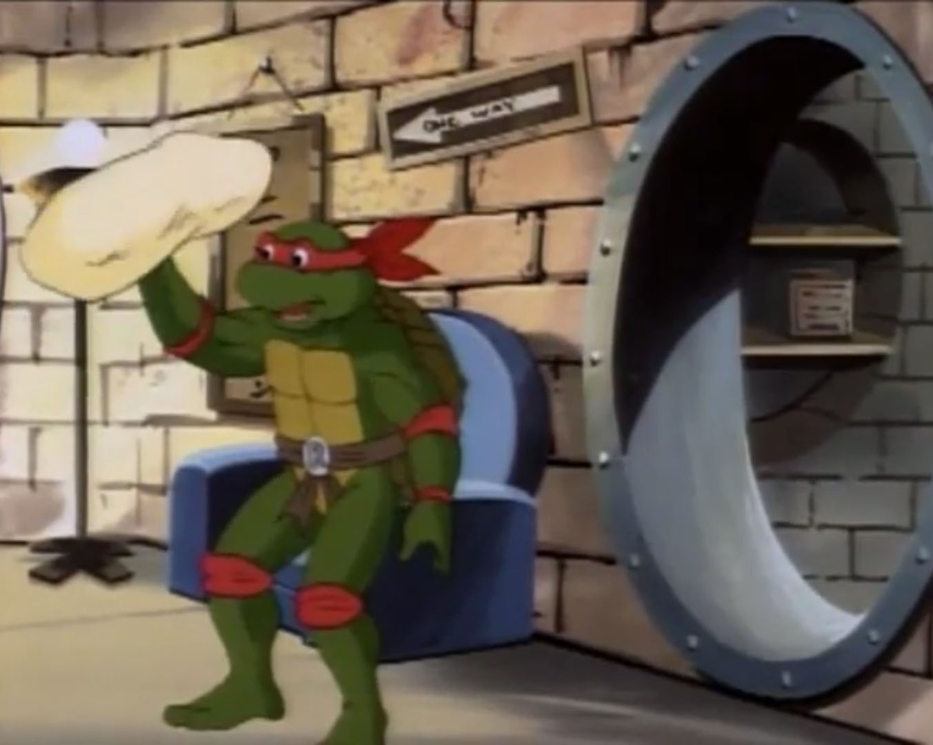 Enfin dans le canapé du salon, les tortues regardaient un film. Leonardo était content que tout cela soit terminé. Raphael apportait au même moment une PVNI, une pizza volante non identifiée. Et la pâte justement lui échappait des mains pour terminer sur la figure de Michaelangelo !