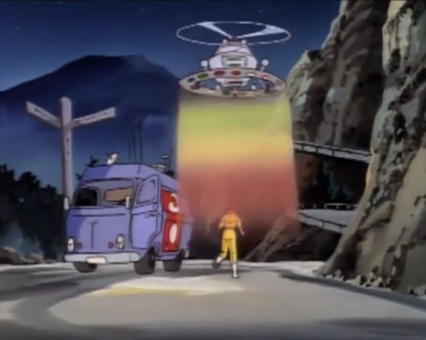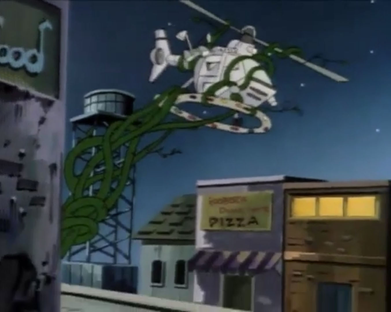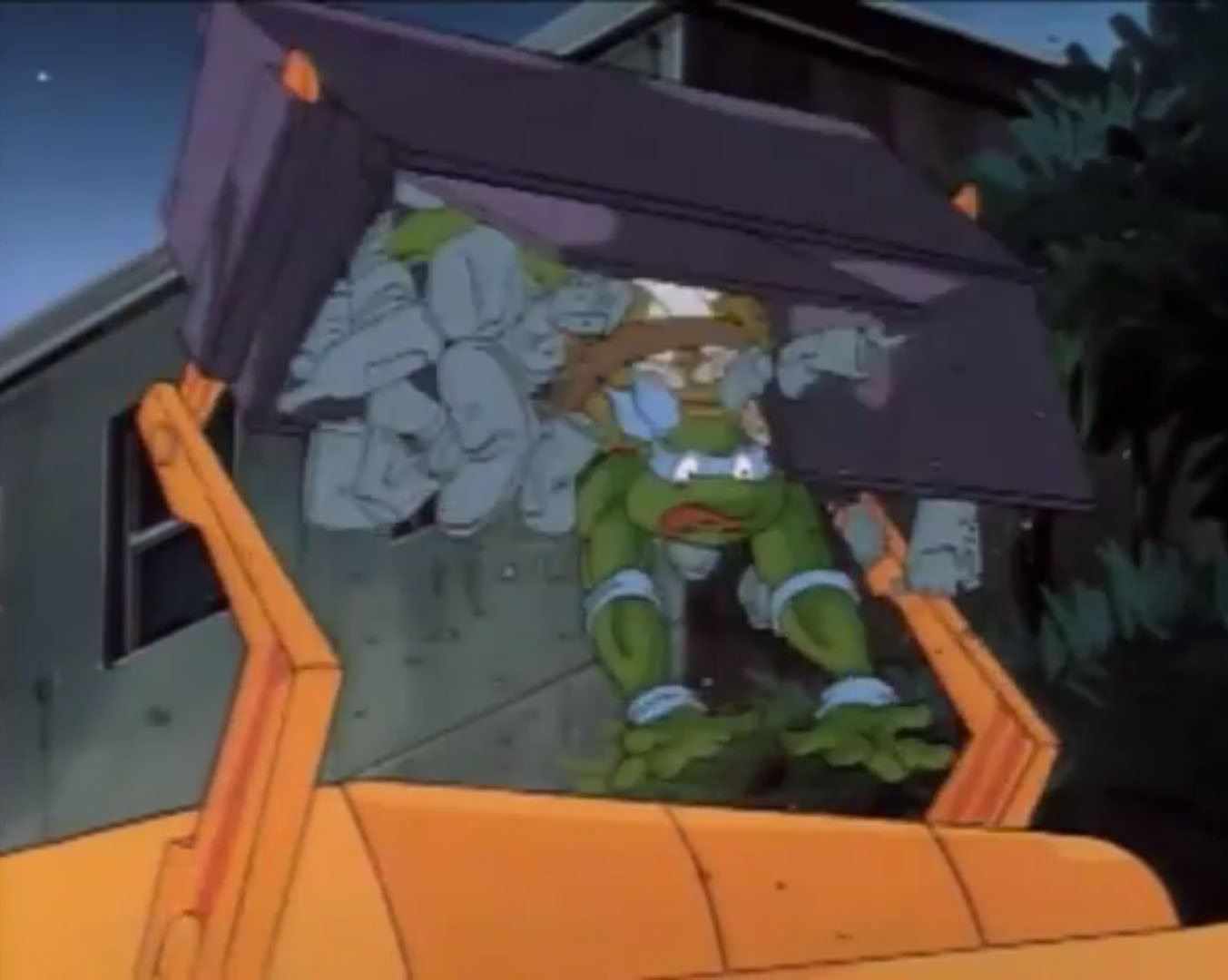 Au sol, les habitants voyaient le Turtle blim s’en aller. Scoop était terriblement déçu pour son article. Billy essayait de le raisonner. Ce n’étaient pas des extraterrestres ! Il leur avait parlé. C’étaient les Tortues Ninja !