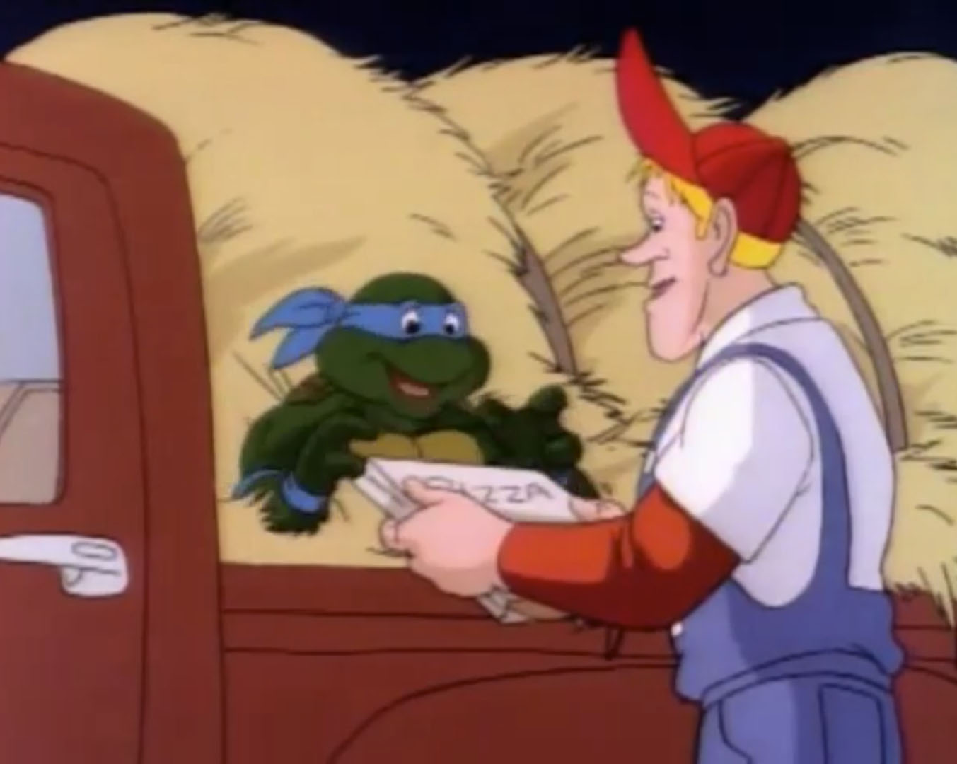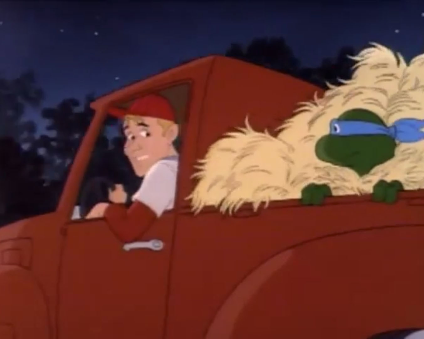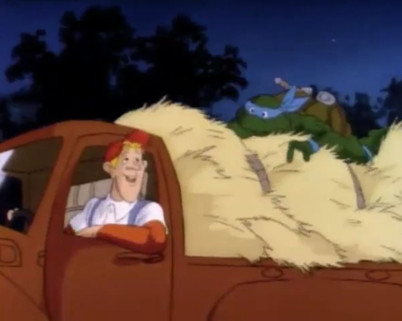 Au même moment, Leonardo arrivait derrière le restaurant. Malgré sa peur, il avait suivi le grand extraterrestre couvert de boue et observait la scène depuis une fenêtre du local. Finalement, il s’agissait bien d’un humain. Il voulait en savoir plus. Le journaliste qui avait convié April avertissait la jeune femme. Ce fermier, Billy, était bête et peu crédible. Ses mots énervaient le témoin, qui frappait du poing sur la table et enclenchait un appareil photo polaroid. Le flash frappait les yeux de Leonardo, qui tombait à la renverse dans une poubelle. Discrédité, le fermier était navré de voir l’image que le village avait de lui… Jusqu’à voir la photo qui sortait de l’appareil. Il s’agissait bien du petit homme vert qu’il avait vu ! La montrant à ses interlocuteurs, il prouvait sa bonne foi. Mais alors, l’extraterrestre était donc dehors !? Tous les hommes sortaient dans la rue pour retrouver Leonardo. La tortue sentait le roussi. Cachée dans la poubelle, elle ne voyait pourtant pas les individus pointer le bout de leur nez. Ils étaient retenus par April qui essayait de couvrir son ami pour lui donner le temps de s’enfuir. Au même moment, un camion benne arrivait. Le véhicule vidait la poubelle où était cachée la tortue avant de repartir terminer sa tournée. Une fois les habitants du village arrivés au niveau de la poubelle, il n’y avait bien plus rien… Finalement, Scoop tenait peut-être son grand reportage. Celui qui le rendrait si célèbre. Tous les fermiers du coin s’organisaient pour chasser cet extraterrestre. C’est qu’il espéraient ainsi devenir riches. Tous, sauf un. Monsieur Davens. Un grand bonhomme avec une chemise rose et un chapeau de cowboy. Il avait bien mieux à faire que cette chasse à l’inconnu ! Il montait calmement dans son camion. Son imposante cargaison était cachée sous une épaisse bâche.