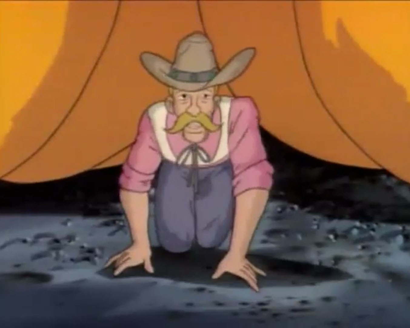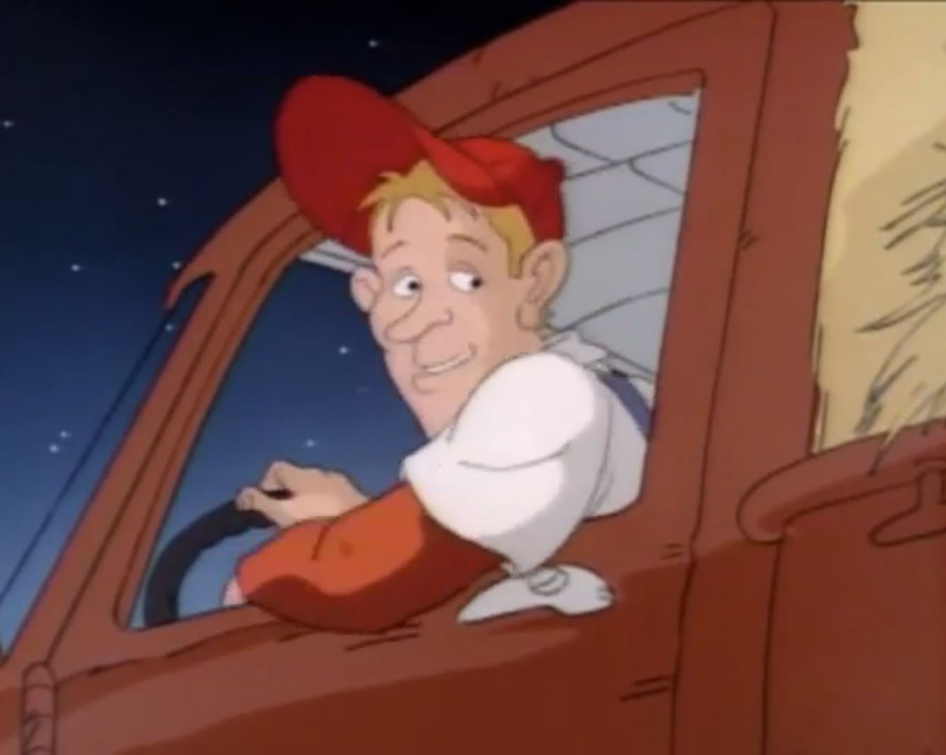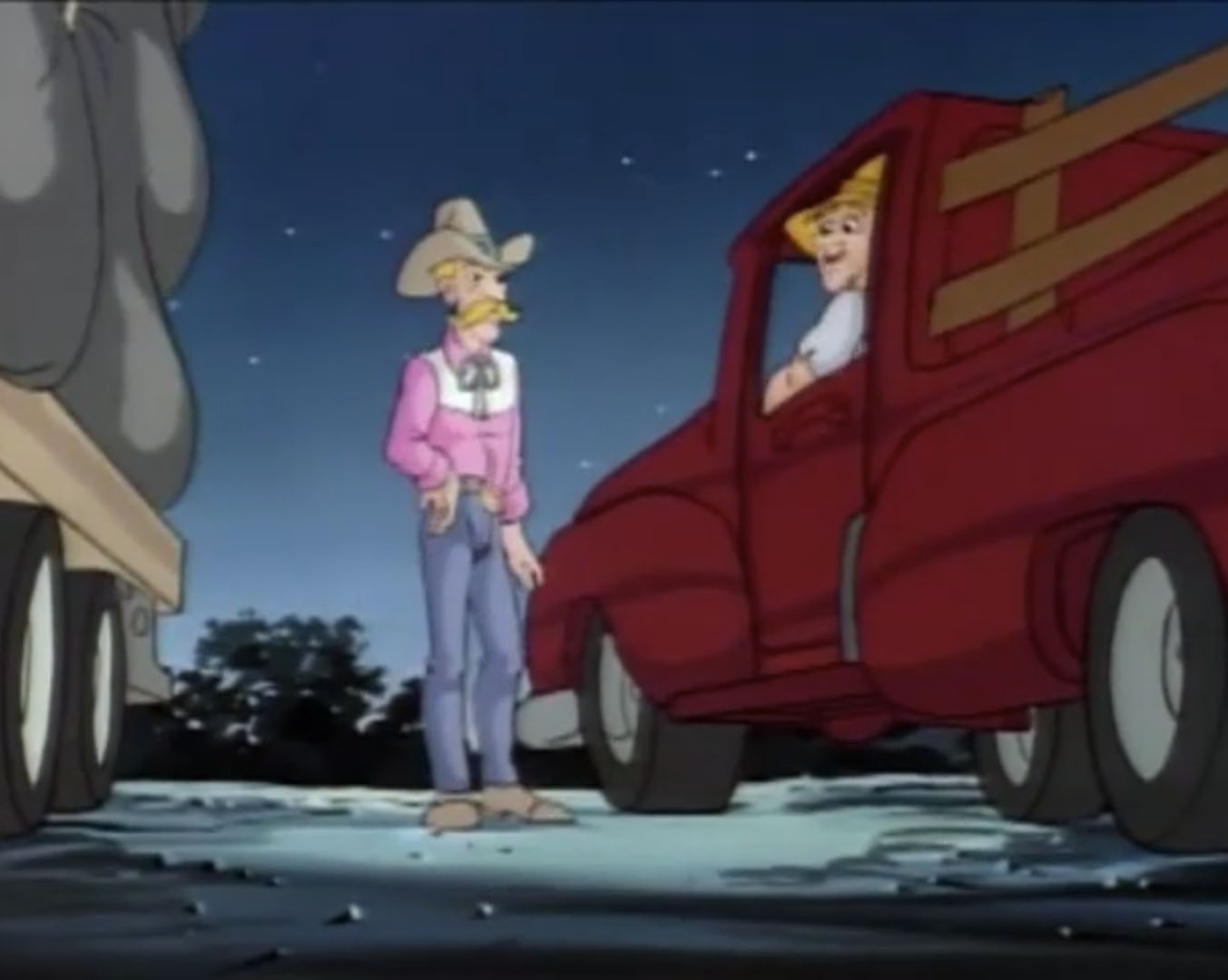 Au même moment, Leonardo arrivait derrière le restaurant. Malgré sa peur, il avait suivi le grand extraterrestre couvert de boue et observait la scène depuis une fenêtre du local. Finalement, il s’agissait bien d’un humain. Il voulait en savoir plus. Le journaliste qui avait convié April avertissait la jeune femme. Ce fermier, Billy, était bête et peu crédible. Ses mots énervaient le témoin, qui frappait du poing sur la table et enclenchait un appareil photo polaroid. Le flash frappait les yeux de Leonardo, qui tombait à la renverse dans une poubelle. Discrédité, le fermier était navré de voir l’image que le village avait de lui… Jusqu’à voir la photo qui sortait de l’appareil. Il s’agissait bien du petit homme vert qu’il avait vu ! La montrant à ses interlocuteurs, il prouvait sa bonne foi. Mais alors, l’extraterrestre était donc dehors !? Tous les hommes sortaient dans la rue pour retrouver Leonardo. La tortue sentait le roussi. Cachée dans la poubelle, elle ne voyait pourtant pas les individus pointer le bout de leur nez. Ils étaient retenus par April qui essayait de couvrir son ami pour lui donner le temps de s’enfuir. Au même moment, un camion benne arrivait. Le véhicule vidait la poubelle où était cachée la tortue avant de repartir terminer sa tournée. Une fois les habitants du village arrivés au niveau de la poubelle, il n’y avait bien plus rien… Finalement, Scoop tenait peut-être son grand reportage. Celui qui le rendrait si célèbre. Tous les fermiers du coin s’organisaient pour chasser cet extraterrestre. C’est qu’il espéraient ainsi devenir riches. Tous, sauf un. Monsieur Davens. Un grand bonhomme avec une chemise rose et un chapeau de cowboy. Il avait bien mieux à faire que cette chasse à l’inconnu ! Il montait calmement dans son camion. Son imposante cargaison était cachée sous une épaisse bâche.