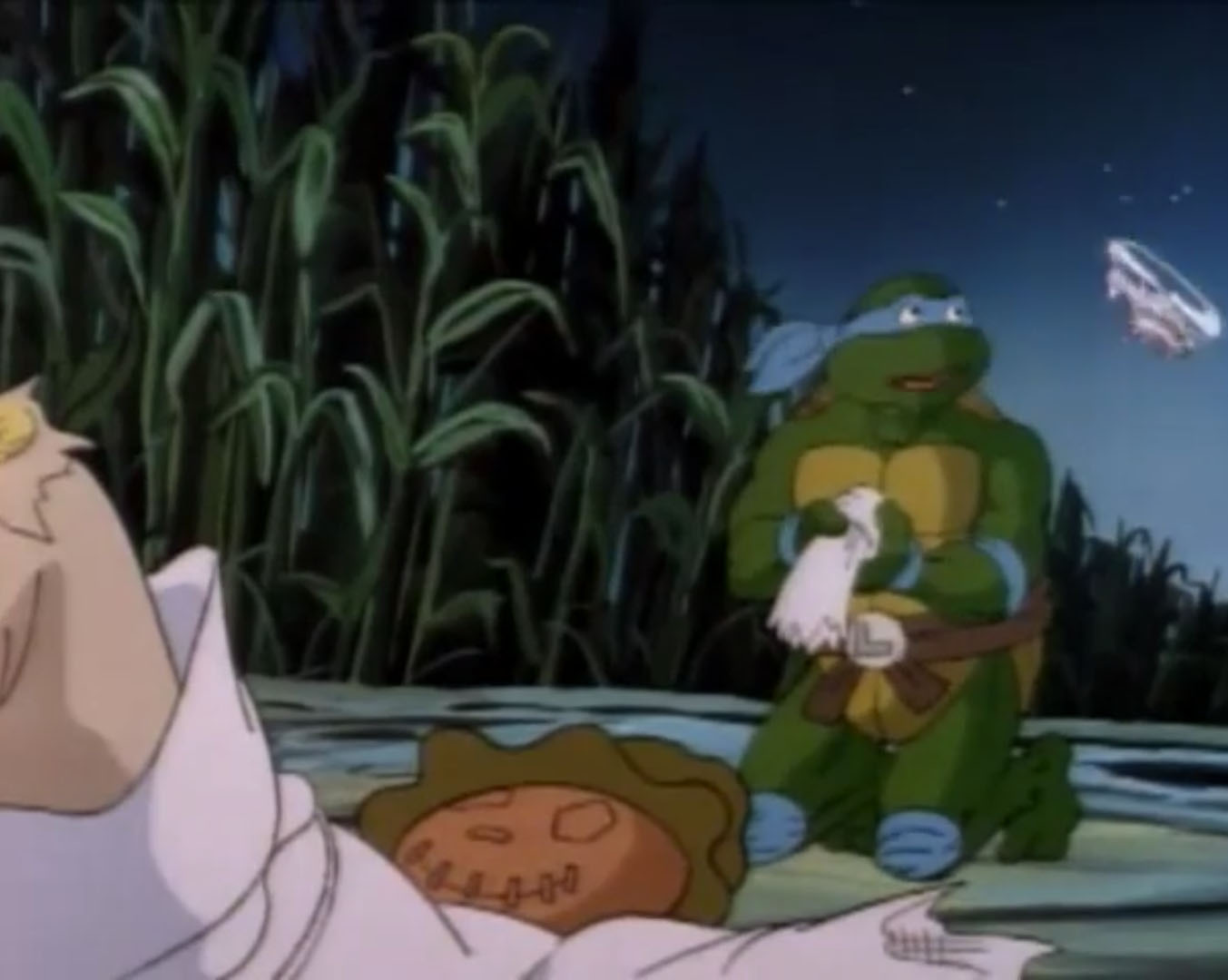 Le jeune ninja partait à bord du Turtle van. Il restait à bonne distance d’April pour ne pas qu’elle le surprenne. Il arrêtait le véhicule dans un champ pour ne pas être vu des habitants à proximité. C’est alors que les épis de maïs autour de lui se mirent à grandir de manière totalement folle. La tortue était poussée par les tiges qui mesuraient plusieurs mètres de haut. Vite descendu de là, le ninja se faisait agripper par des bras. Ses réflexes le faisaient jeter son adversaire au sol immédiatement. Non sans quelques dégâts, le bras gauche de l’agresseur lui restait dans ses bras. Il s’agissait d’un épouvantail ! Quelque chose d’étrange se passait là. Et c’était sans compter sur la soucoupe volante qui passait dans son dos sans qu’il s’en aperçoive ! Il avait bien fait de venir tout compte fait…