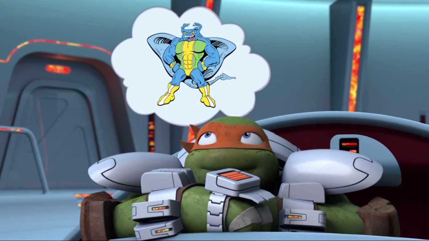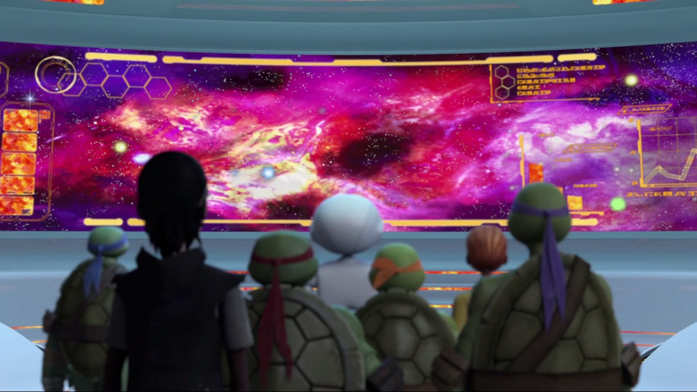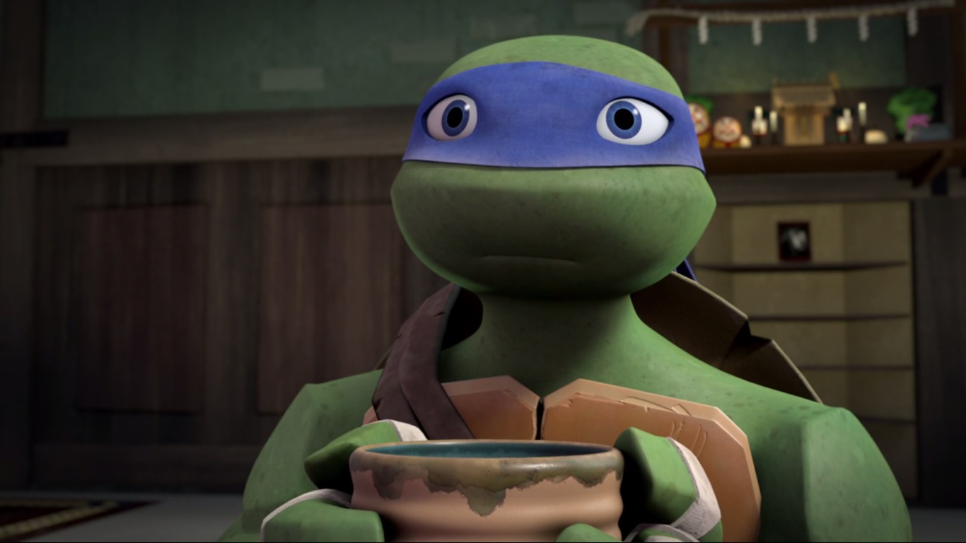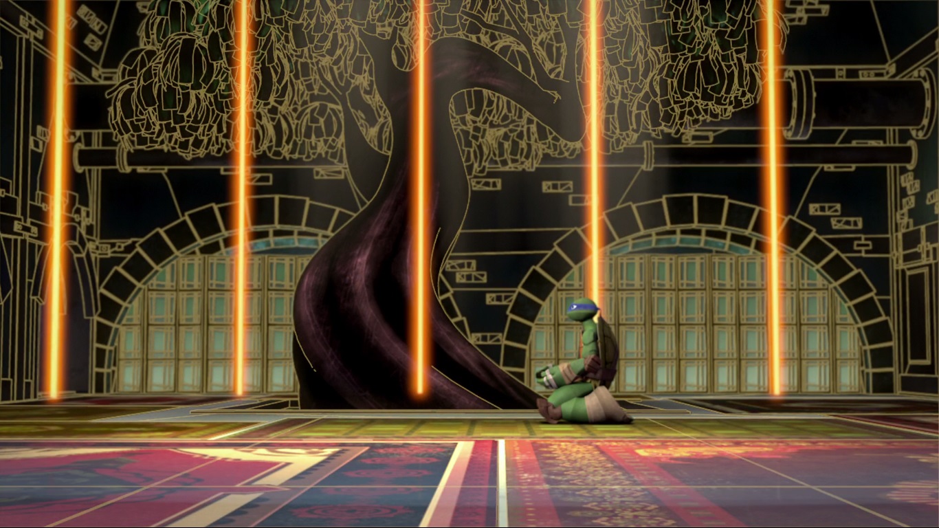 Dans la salle à hologrammes, Leonardo était partit s’entretenir virtuellement avec Splinter. Découragé par le défi qu’il allait devoir surmonter avec ses frères, déboussolé suite à la défaite sur Terre, il avait besoin d’entendre les conseils avisés de son père qui lui manquait. Le simulateur se basait sur les souvenirs pour recréer une image virtuelle. Cette matérialisation de Splinter était donc presque parfaite.