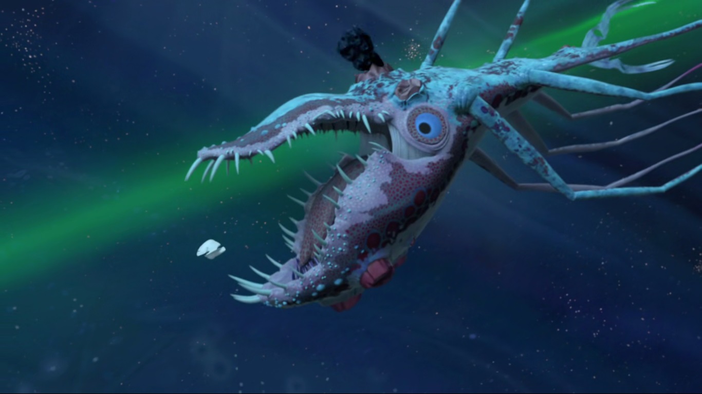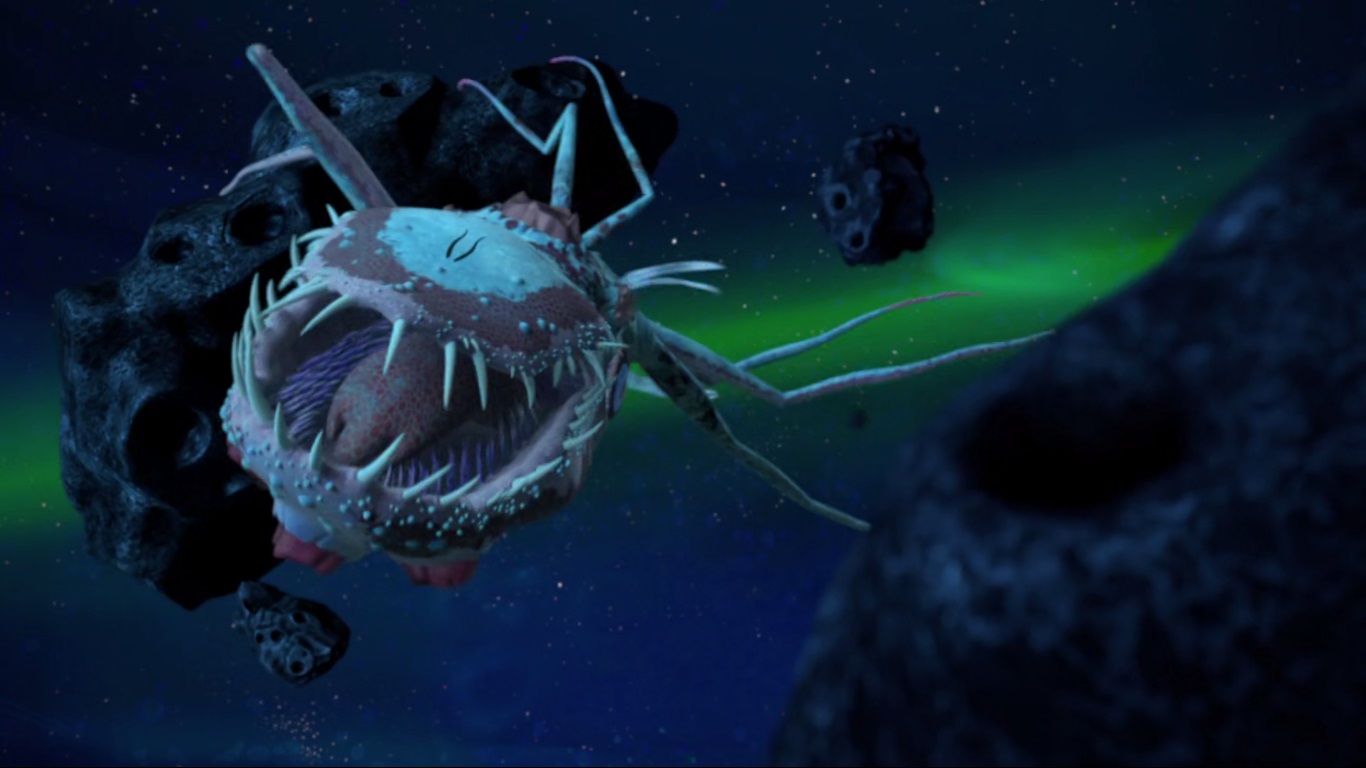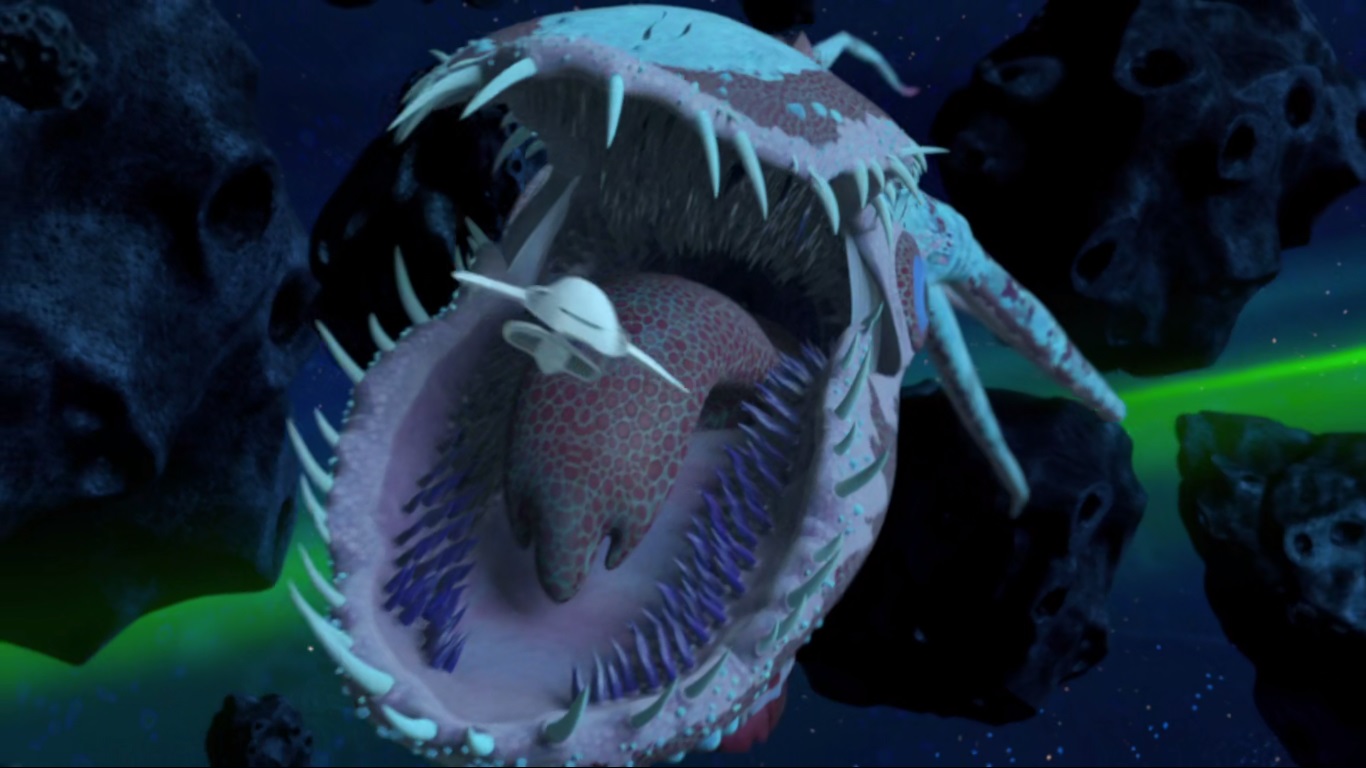 Le groupe arrivait dans une grotte sombre composée d’un seul boyau. L’éclairage de l’Ulixes permettait à peine de voir des choses ramper, comme des vers géants. April, à l’aide de ses pouvoirs, détectait une présence remarquable. Ils ne tardaient pas à faire la rencontre de Cthugga, une créature gigantesque avec une bouche colossale et des tentacules. Le Fugitoid faisait très rapidement demi-tour et permettait à ses amis de sortir de la grotte au plus vite. La créature se lançait à leur poursuite. L’Ulixes ne parvenait pas à s’en débarrasser. Finalement, grâce à sa petite taille, le vaisseau passait dans un astéroïde pour échapper à son poursuivant puis se cachait contre la paroi d’un autre rocher volant, attendant que la créature abandonne sa chasse. Alors que tous pouvaient enfin souffler, Armaggon se faisait électrifier et tombait au sol. Les daagons étaient venus porter secours à leurs amis après avoir reçu un S.O.S émis par le Fugitoid. Ils ordonnaient la capture du requin. Toutefois, Leonardo craignait le pire dorénavant ; la rencontre avec Cthugga n’avait pas été des meilleures et Hiidrala risquait de ne plus pouvoir leur faire confiance…