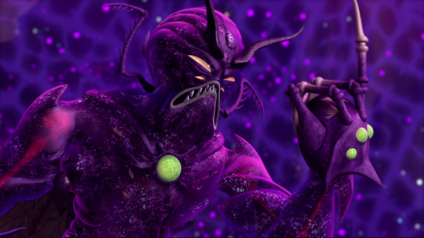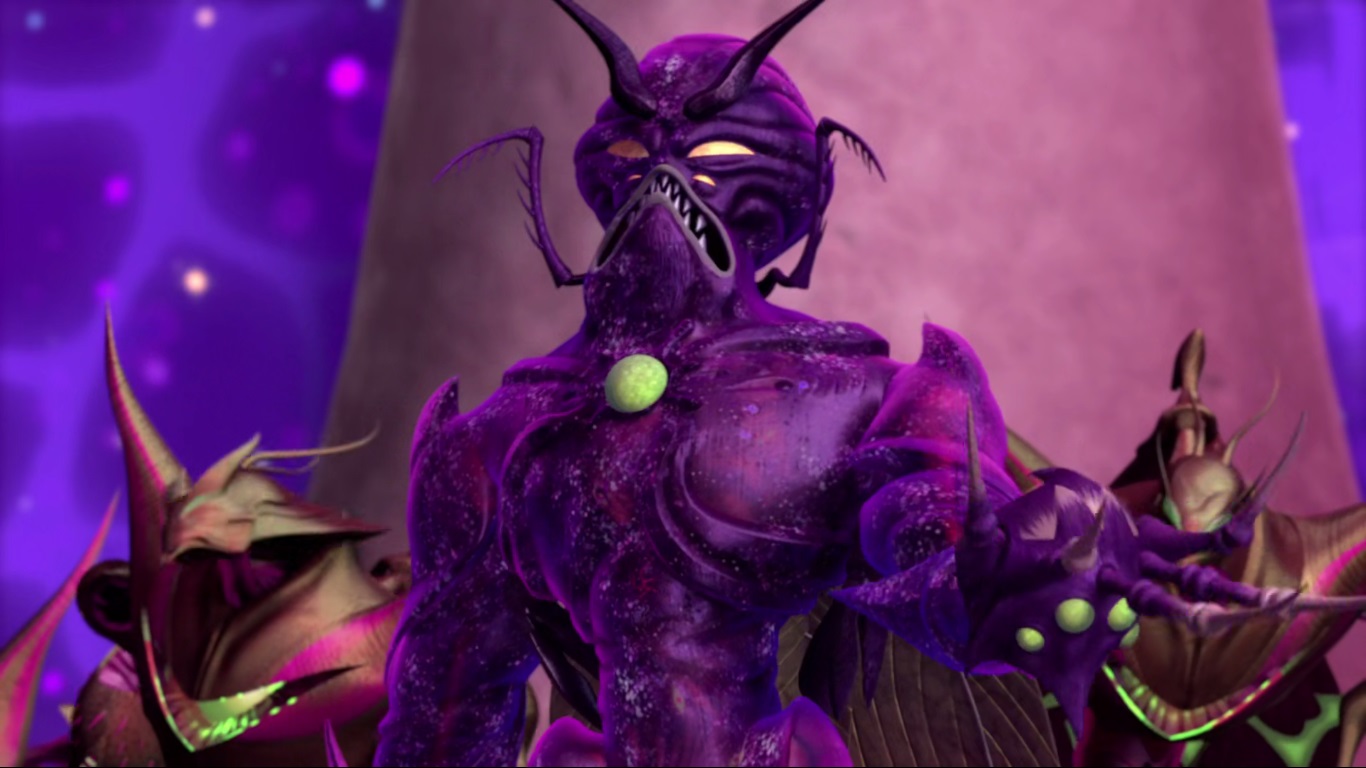L’équipage revenait au palais de la souveraine bredouille et avec Armaggon capturé. Hiidrala voulait sévèrement réprimander le requin. Quant aux visiteurs, ils n’étaient pas parvenus à passer le test de Cthugga et demandaient une seconde chance. Au même moment, des gardes daagons tombaient inconscients. Lord Dregg était venu en personne, avec ses Vreens, réclamer la seconde partie du Cœur des Ténèbres. Il en était hors de question pour la souveraine et les tortues s’interposaient pour la protéger. Le combat pouvait débuter. Les quatre frères comme les gardes tentaient de protéger Hiidrala. Le seigneur envahisseur était très puissant et repoussait sans mal les terriens. Sans perdre de temps, il s’attaquait à la reine. Leonardo se jetait sur elle pour qu’un tir lancé par le seigneur des Sectoids ne l’atteigne pas. Soudain, Cthugga arriva à son tour, appelé par la reine d’un terrible cri. De ses tentacules il s’emparait d’Armaggon et de Dregg et les avalait. Les Vreens fonctionnant comme un essaim, prenaient la fuite désorientés par la disparition de leur supérieur.
