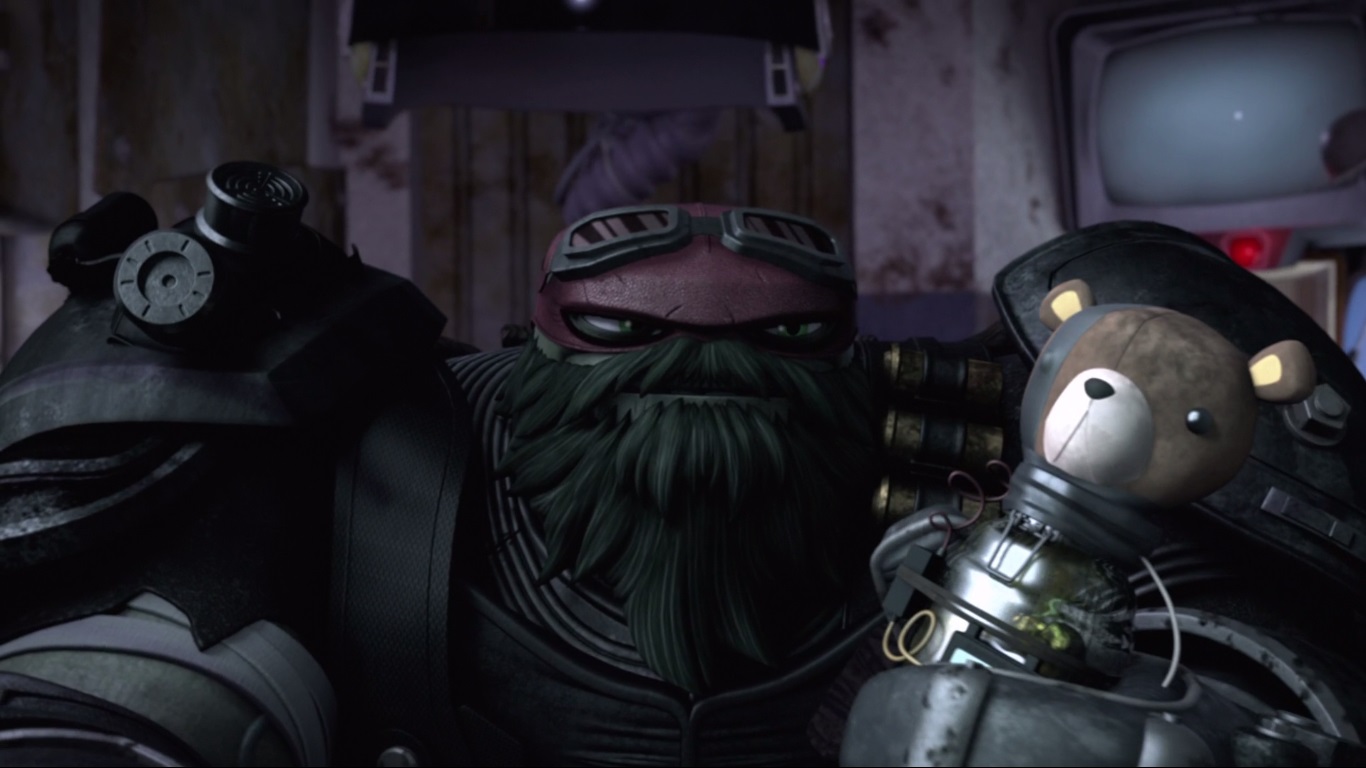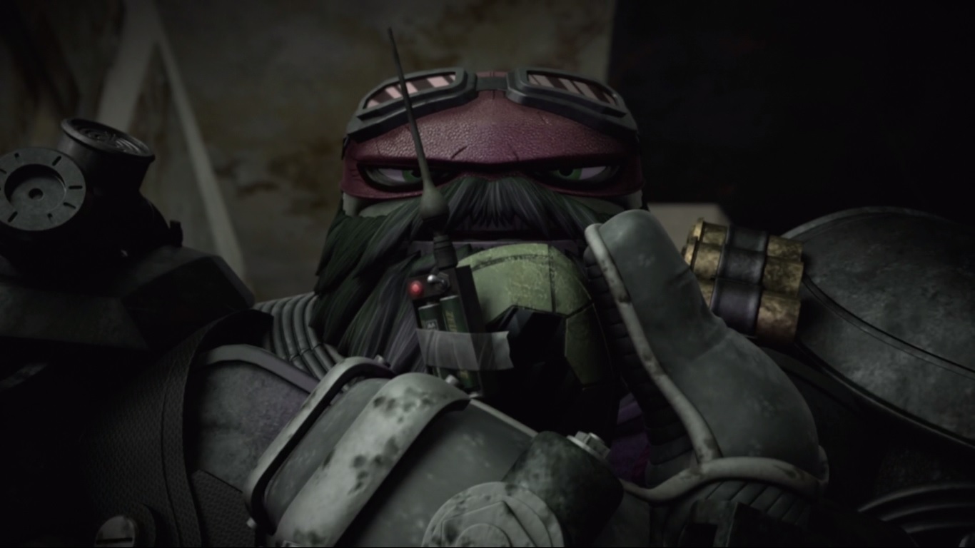 Raphael s’était assoupi un petit peu. Resté à l’extérieur du véhicule, quelque chose le réveillé. La tortue s’empressait éteindre le baril de feu et sortait son arme. Il n’entendait plus rien. Alors qu’il venait de baisser sa garde il était attaqué par derrière par un groupe de mutants, les Honey Badger Ravager (Blaireaux du bitumeVF). Se débarrassant des premiers assaillants, l’ancien ninja se faisait violemment frapper par la main mécanique de l’un d’eux. Il s’agissait de leur chef, Verminator Rex. Peut-être la tortue allait-elle pouvoir les aider. Ils cherchaient une femme et une carte. Ne se laissant pas abattre par le nombre, la tortue continuait de se faire passer à tabac. Son T-phone volait au sol. Tendant son bras vers l’appareil, il appelait à l’aide Donatello. En quelques instants, la trappe du toit du véhicule s’ouvrait et une boule sombre en sortait. Il s’agissait d’un robot en forme de tortue ninja. Deux bâtons métalliques sortaient de ses mains avant de fondre sur ses ennemis.